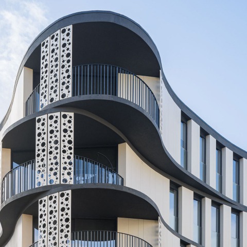 El edificio Sense 100 baila a través de largas ondas, diferentes en cada planta. El diseño orgánico y los paneles proyectados en la fachada crean dinamismo, movimiento y momentos.