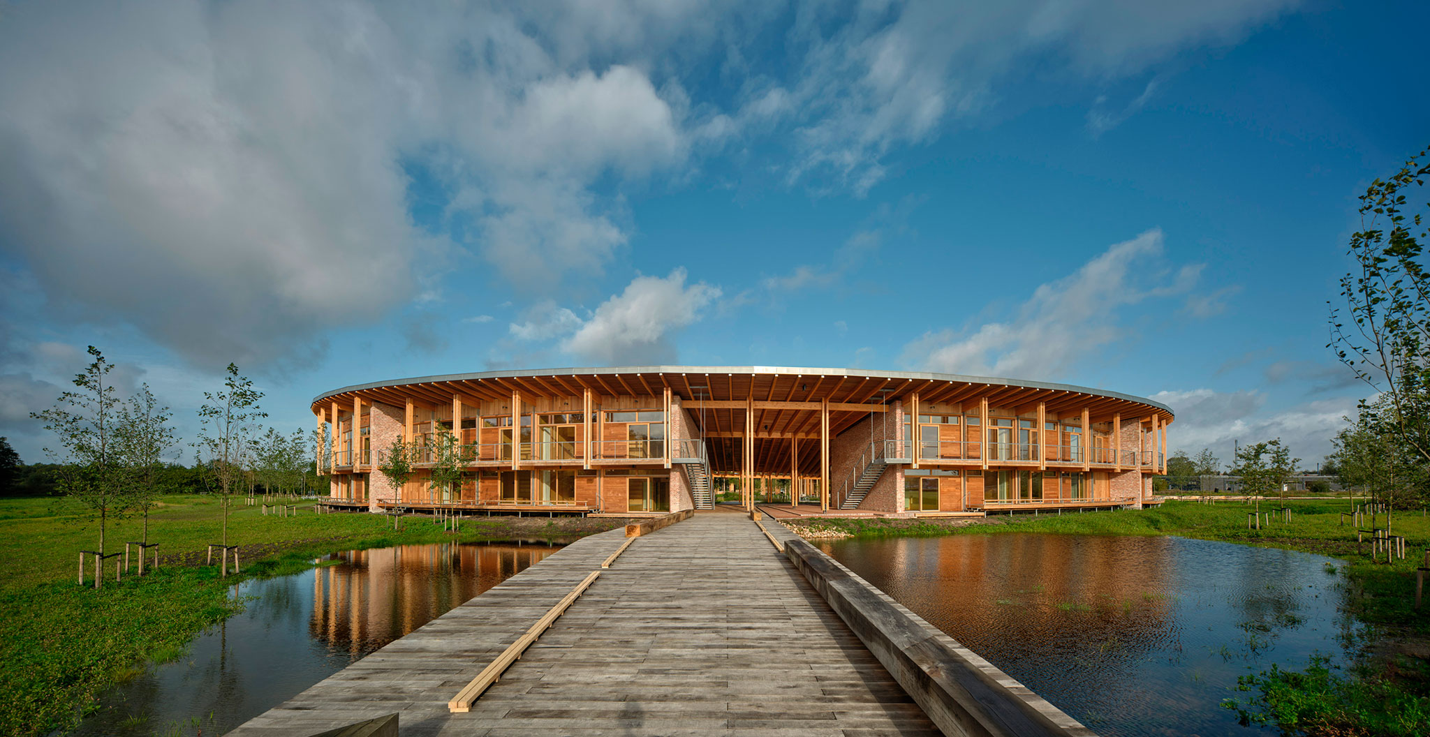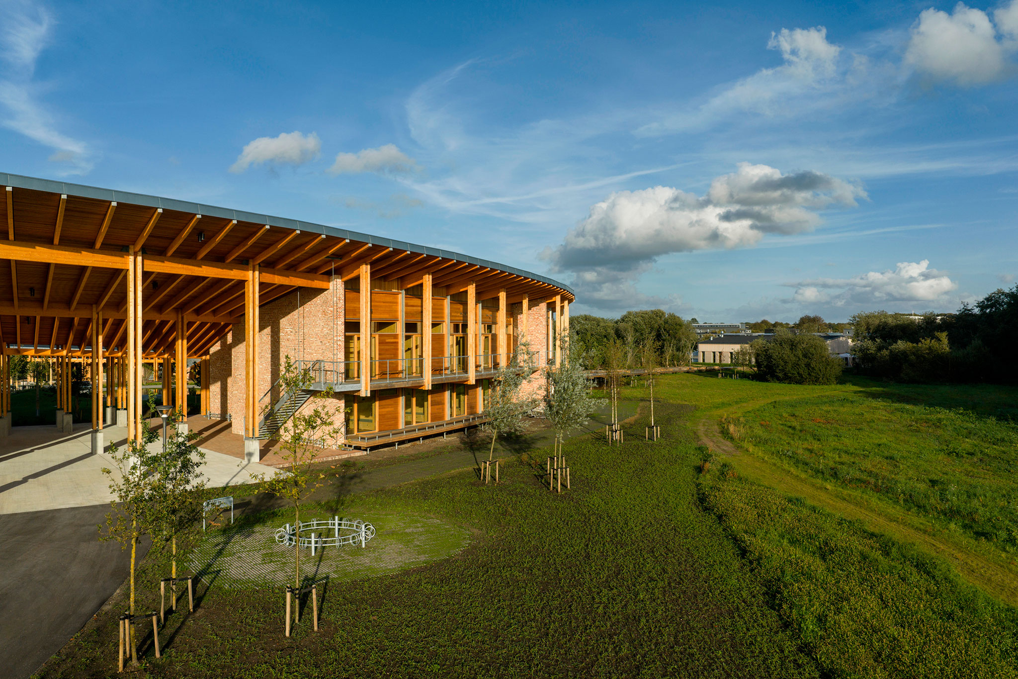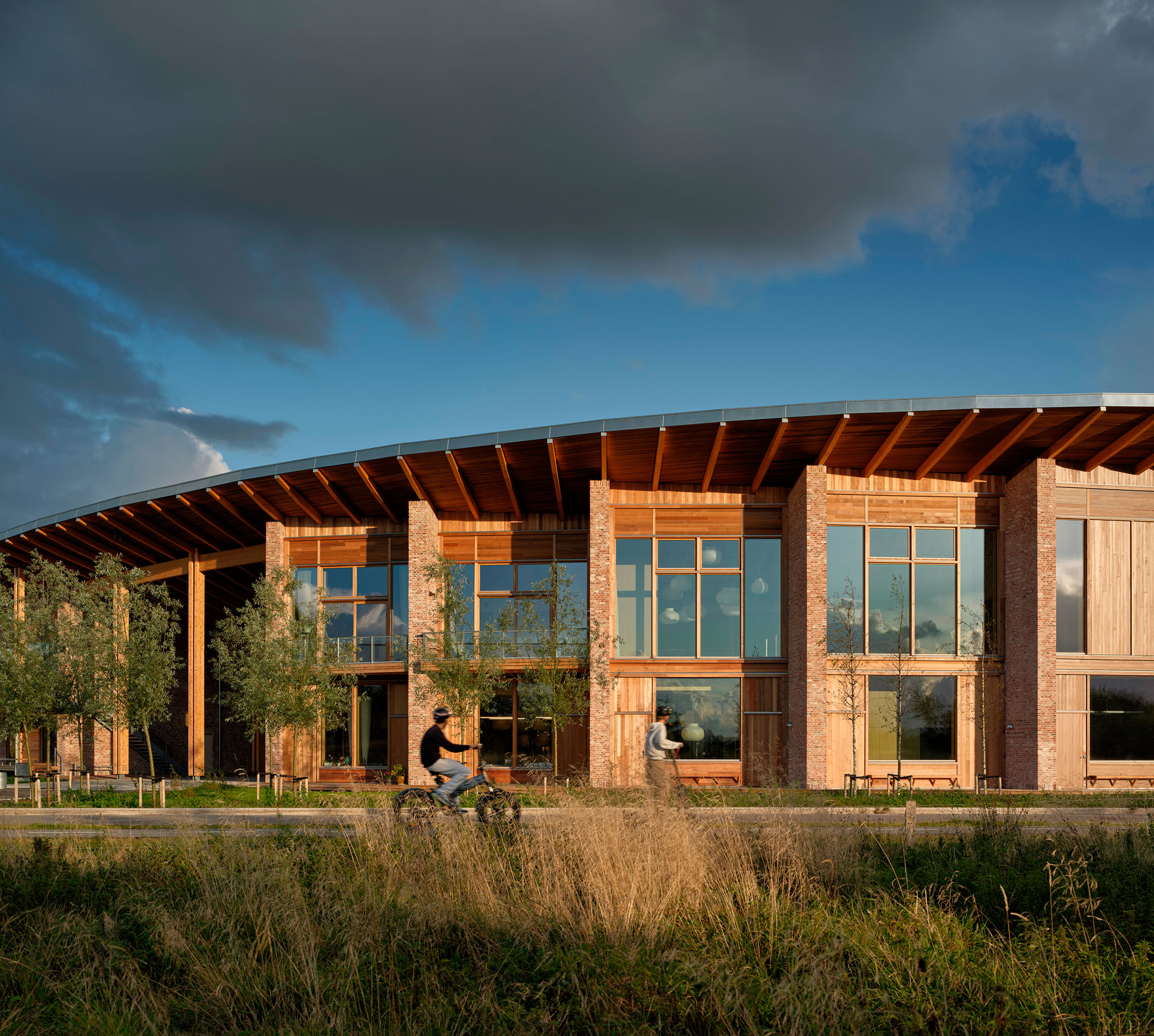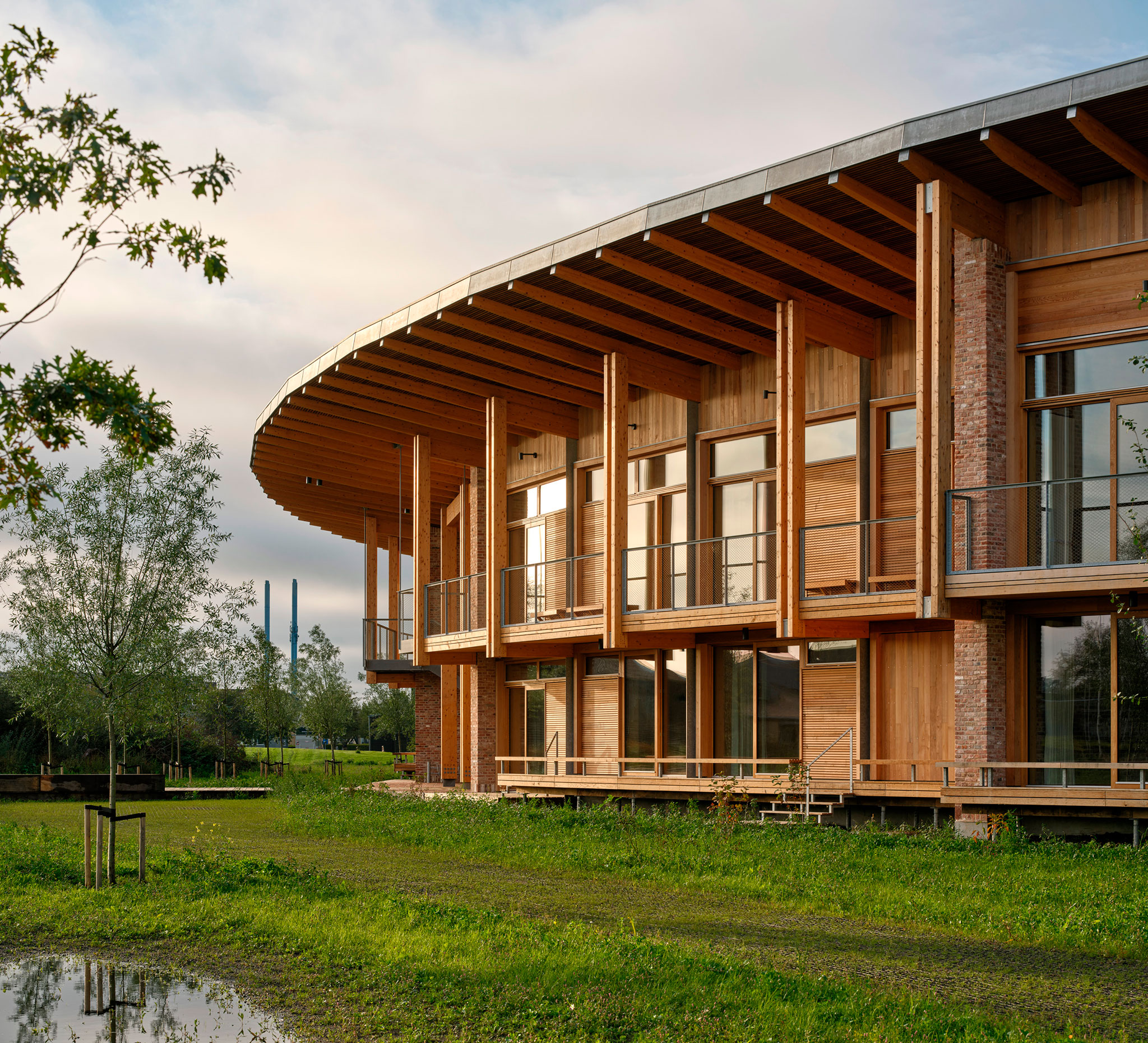 Para reducir la huella de carbono, se utilizaron materiales duraderos, cercanos y de bajo impacto, como la madera (eligiendo especies de árboles según su función: cedro para fachadas, roble para puertas y pasarelas, abeto para paneles interiores y pino para la estructura principal), la pizarra, el granito y 700.000 ladrillos procedentes de edificios demolidos, cuyas irregularidades generan una estética diversa e irregular. La estructura utiliza muros de carga de ladrillo y madera laminada, libre de productos químicos.