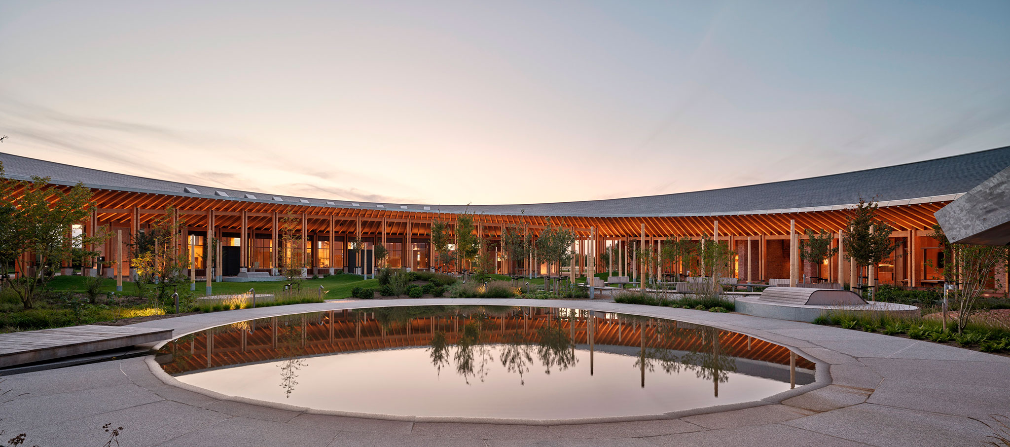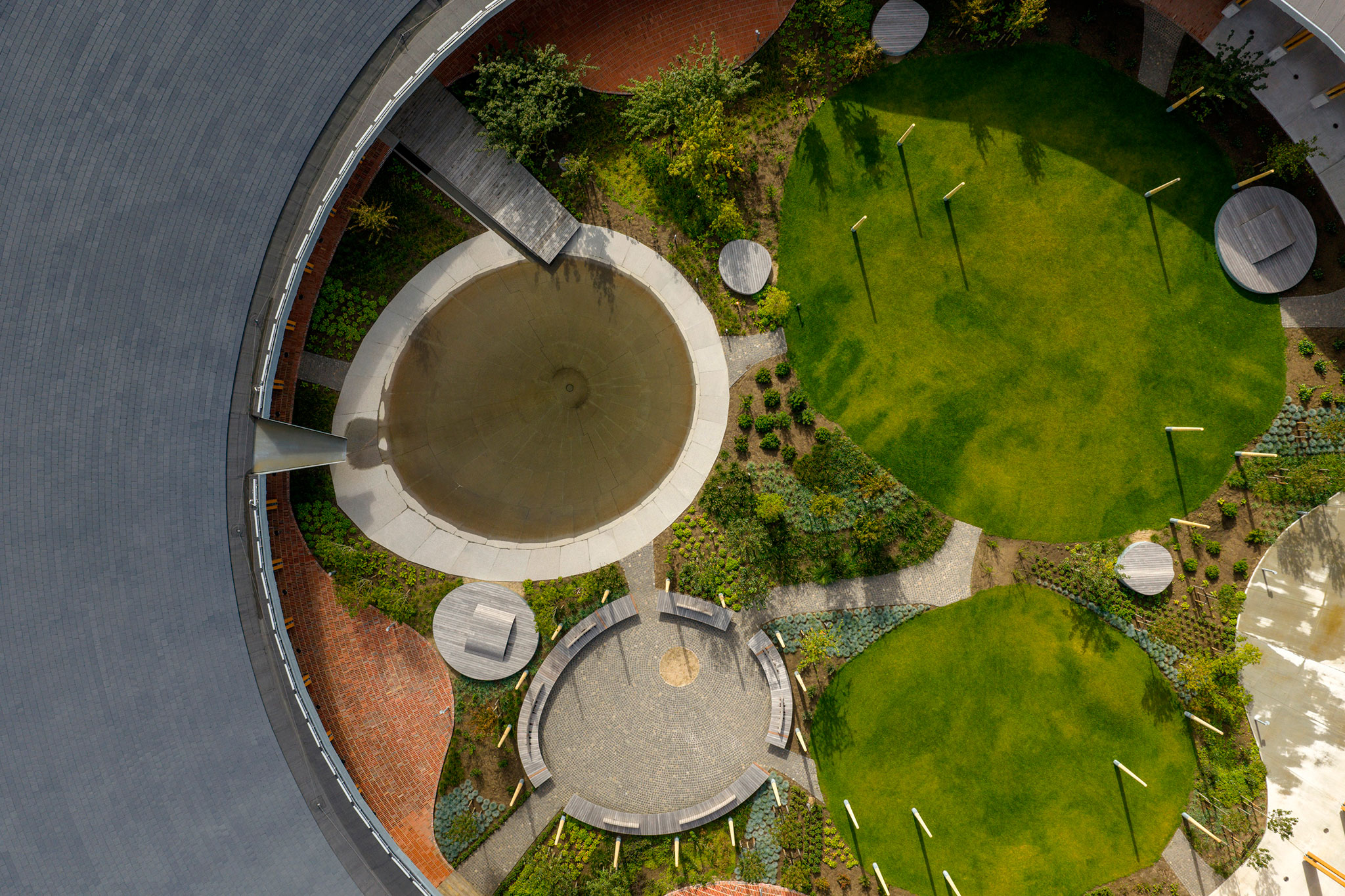 Diseñado para resistir el uso y el cambio durante muchos años, el diseño prioriza materiales naturales, duraderos y de bajo impacto, arraigados en diferentes tradiciones artesanales, incluyendo diversos tipos de madera certificada, pizarra, granito y ladrillos reciclados. Se han utilizado más de un millón de ladrillos recuperados para paredes y suelos, tanto exteriores como interiores. Con rastros visibles de desgaste, residuos de mortero y pintura, estos ladrillos introducen capas narrativas en la arquitectura, creando una expresión táctil y texturizada.