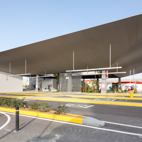 Volumétricamente, se dispone de un gran plano de cubierta, que debe proporcionar gran cantidad de sombra y protección en los apeaderos, conformando de esta forma el elemento principal de la edificación. Dicho volumen aloja los apeaderos, la zona interior de la estación con taquillas, espera y servicios, y en la parte posterior una estación de servicio y tienda anexa. El gran plano de cubierta se perfora en su zona interior para ubicar un gran jardín interior cuya misión es servir de foco de luz, punto de referencia y separación entre los usos de estación de autobuses y de servicio.