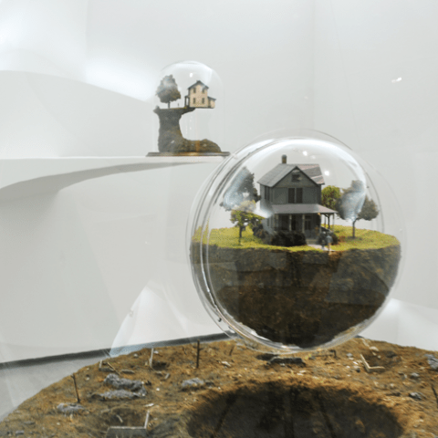 Thomas Doyle esculpe cuidadosamente diminutas escenas de destrucción, desastre y caos, encerrados en burbujas de cristal. En el centro de su obra está la icónica casa americana, que puede verse al borde de precipicios, o cortadas por la mitad. Las figuritas se encuentran rodeadas por el caos apocalíptico, caminando con maletas o enterrando a sus muertos. Su trabajo sirve como una metáfora no sólo de la crisis actual, sino mas allá, de que la casa tradicional americana no es el refugio que el ciudadano espera que sea.