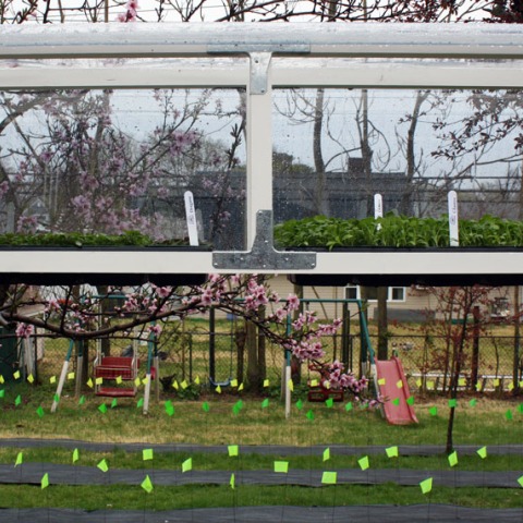 Among the re-imaginings that transformed each home into a personal business: House Dress by L.E.FT playfully wrapped the building exterior in a giant skirt, turning its interior into a casino; Bright Dawn Farm designed by Freecell (pictured) transformed a backyard into an agrarian farm with a 60-foot linear greenhouse; and an installation by EFGH visualized a service-intense masterplan applied to a six-block case study of Levittown.
