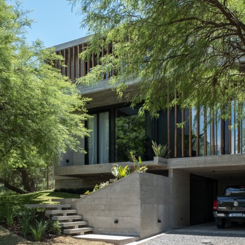 La parcela es de 20 m x 30 m, con un desnivel desde la calle hacia el fondo de 7 m y la presencia de varios árboles autóctonos sobre el frente, que fueron conservados en el retiro con la idea de aportar a la casa protección y calidad ambiental así como también una disminución de su impacto visual, de esta manera, la casa ocupa el centro del terreno, a través de un gran bloque y el apilamiento de actividades.