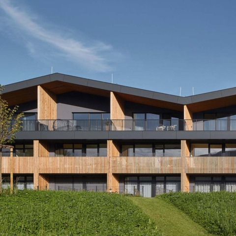 La volumetría del complejo de apartamentos se enfatiza al utilizar la menor cantidad posible de materiales y colores en la fachada del edificio. Los elementos madera que aparecen en la fachada, contrastan con el color base de la fachada oscura, lográndolo gracias a la reducida paleta de materiales.