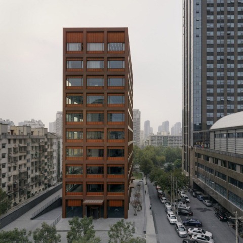 El edificio de oficinas de diez pisos se encuentra en una zona diversificada construida sobre Moganshan Road, cerca del tranquilo parque de Shuyhan en Hangzhou. Dentro de este denso contexto el edificio reafirma su presencia objetual mediante una forma geométrica clara. El posicionamiento del delgado edificio en el centro de la parcela proporciona el suficiente espacio con los edificios vecinos. El volumen se coloca por encima del nivel de la calle, como si se tratara de un escenario. Éste nivel elevado así como la modulación de los espacios exteriores circundantes permiten diversas transiciones entre la ciudad y el edificio.