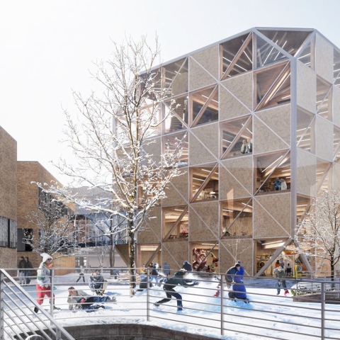 Makers’ KUbe es una estructura cúbica de madera de 4.645 metros cuadrados. La singular estructura diagrid de madera de KUbe, proyectada por el ingeniero estructural StructureCraft, está optimizada para reducir el material y limitar el hormigón con alto contenido de carbono. Inspirada en las técnicas tradicionales de carpintería japonesa, la estructura del edificio utiliza clavijas ajustadas y madera laminada con muescas (o madera laminada con pegamento) para crear una estructura totalmente de madera con columnas y vigas que corren en diagonal, sin placas de acero ni sujetadores.