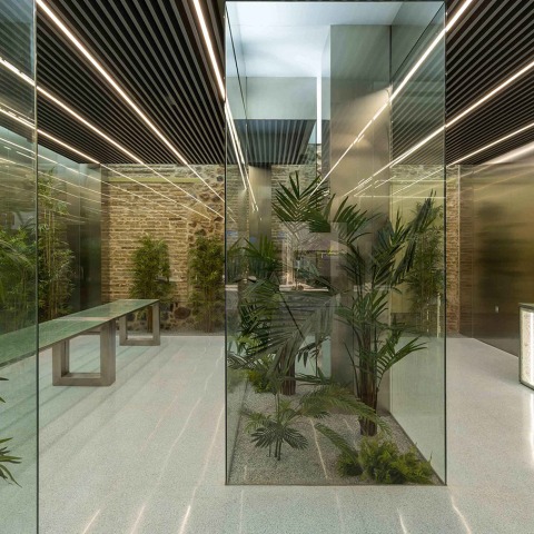 Este recurso es usado para la creación de pozos de luz, que generan espacios abiertos, fluidos y dinámicos en sus transiciones, donde crece la vegetación, aliviando la sensación de espacio interior cerrado. El vidrio también es usado para crear el mobiliario, y es escenografiado con algunos recursos técnicos como el uso de una triple capa de vidrio templado, a la que se le rompe in situ la luna intermedia, con el fin de provocar ese efecto mojado de gota de agua sostenida en el tiempo.