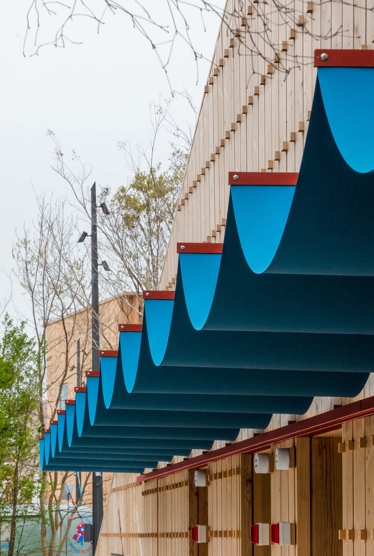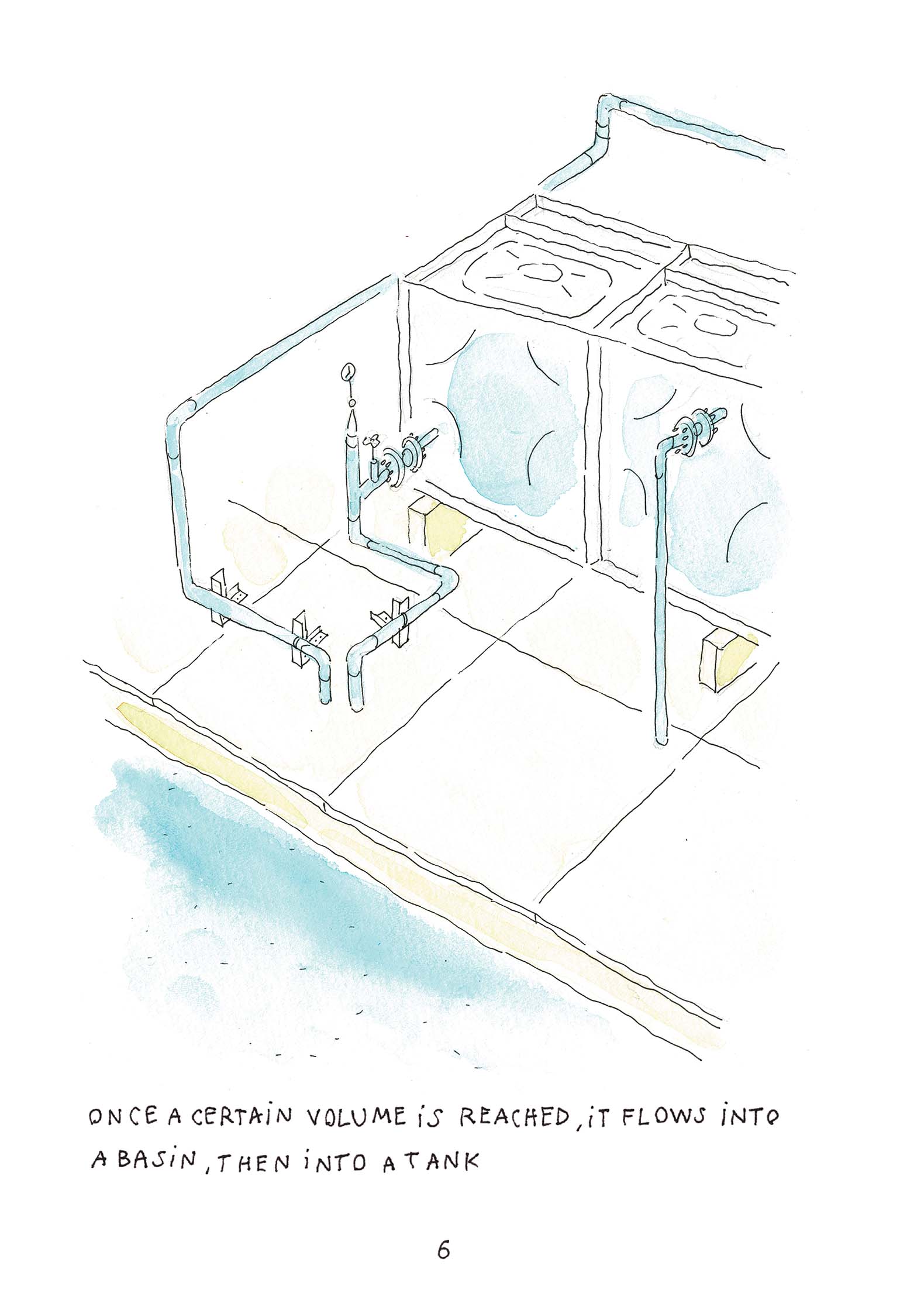 Los baños están proyectados como un pabellón de agua. La lluvia cae del cielo, se evapora, forma nubes y vuelve a caer. La lluvia también es captada, utilizada y evacuada. A lo largo de este ciclo continuo surgen momentos de encuentro entre las personas y el agua. Este pabellón invita a los visitantes a percibir y sentir los fenómenos invisibles del agua — fuente de toda vida — en un espacio donde es esencial: el baño. Está construido con materiales moldeados por el agua: madera alimentada por los ríos, piedras suavizadas por los arroyos y pintura natural de color azul claro.