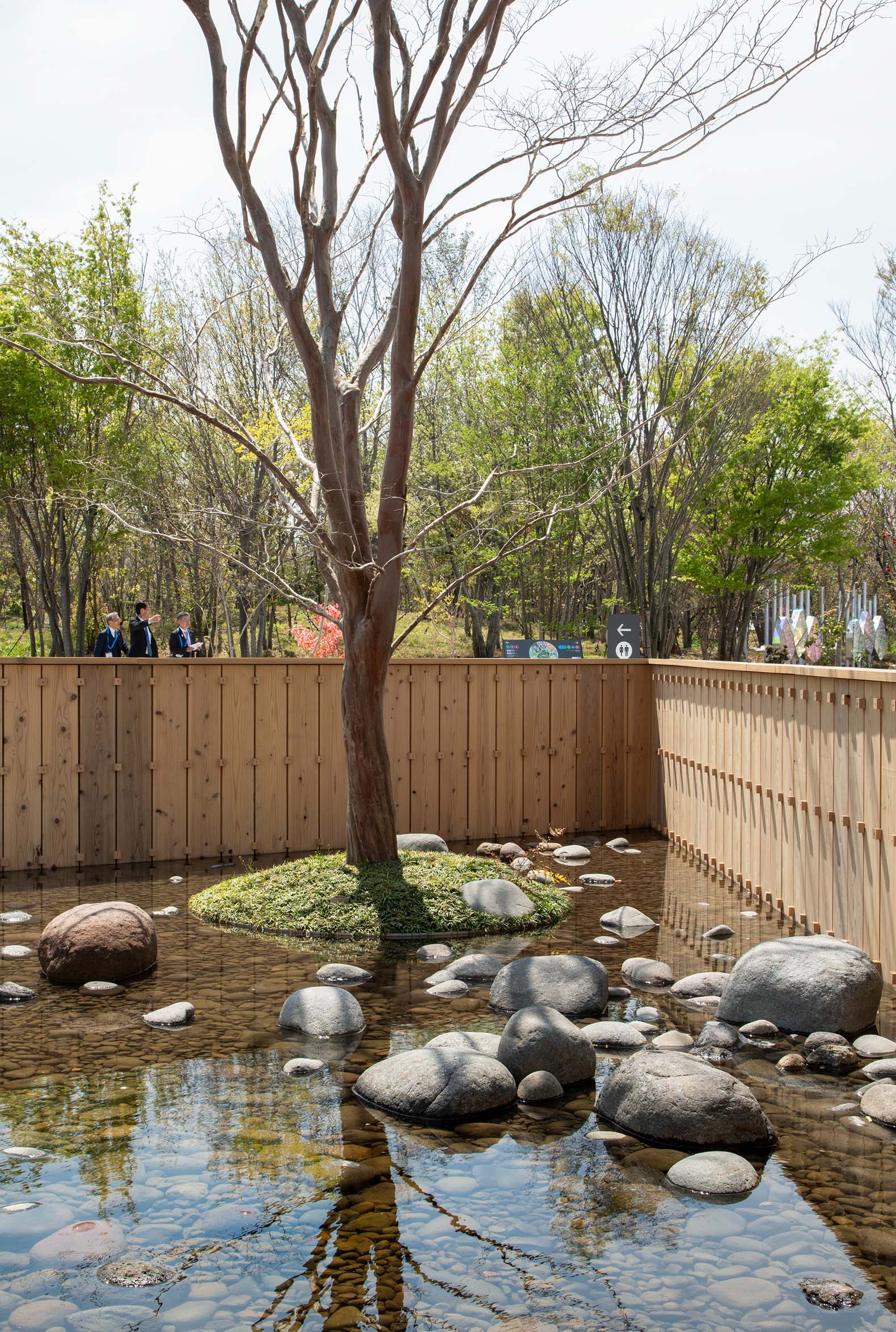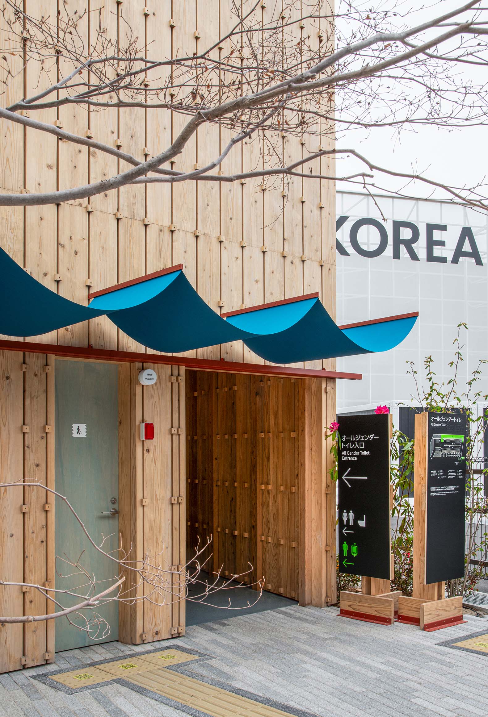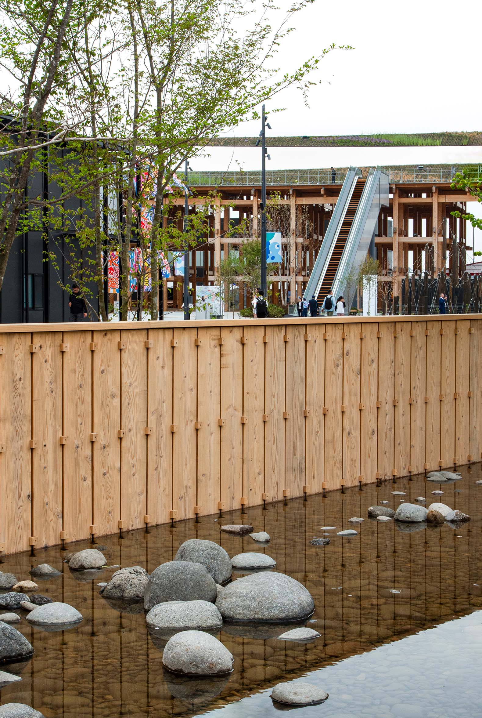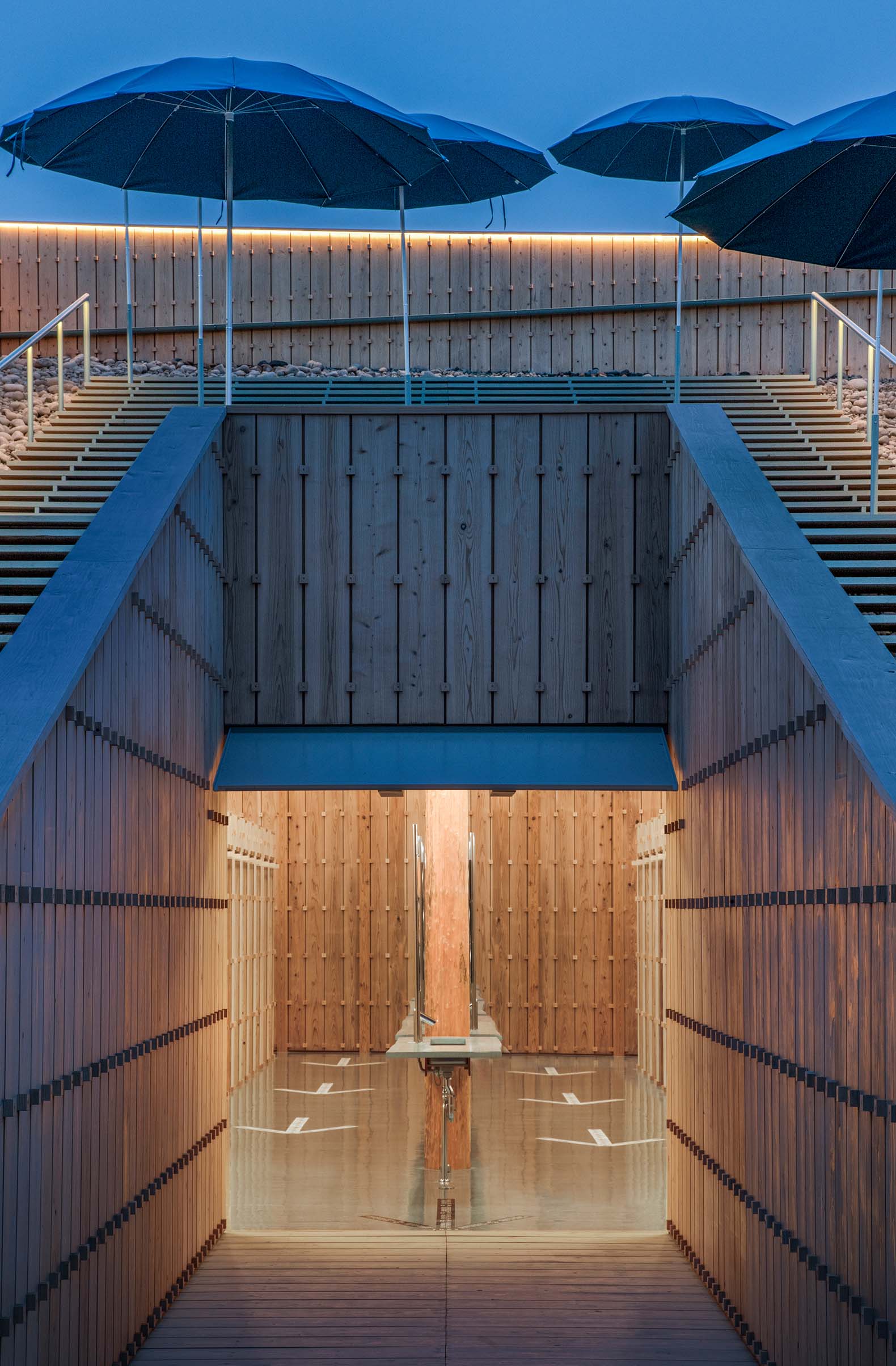 El pabellón de Kuma&Elsa plantea una experiencia diferente desde el primer instante. Se concibió como un espacio abierto, sin identidad de género, inspirado en la idea de que todos somos «peces que nadan en el mismo agua». La disposición del espacio permite abarcarlo de un solo vistazo, sin rincones ocultos, mientras la pendiente del edificio favorece la ventilación natural, llenando el ambiente con el suave aroma de la madera de cedro. El agua que fluye sobre la cubierta refleja, casi como un espejo, los movimientos de quienes transitan en su interior, integrando cuerpo y arquitectura en un diálogo constante.