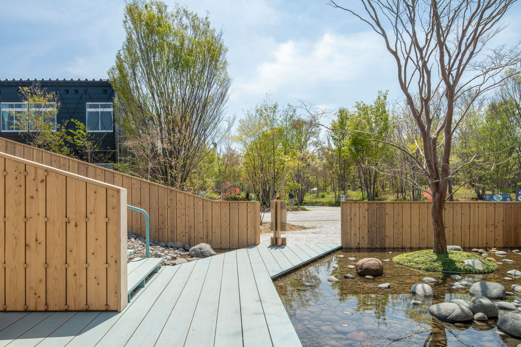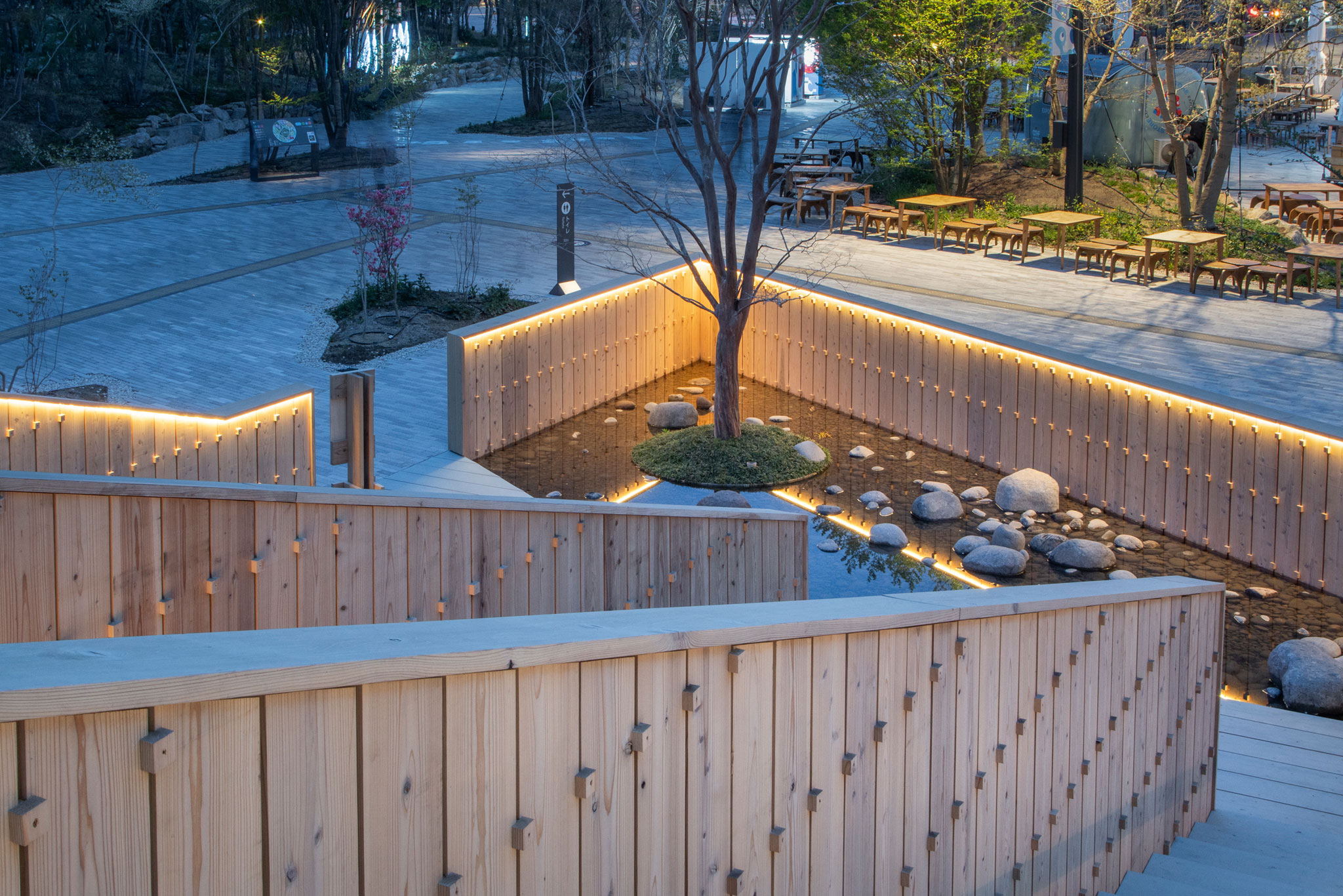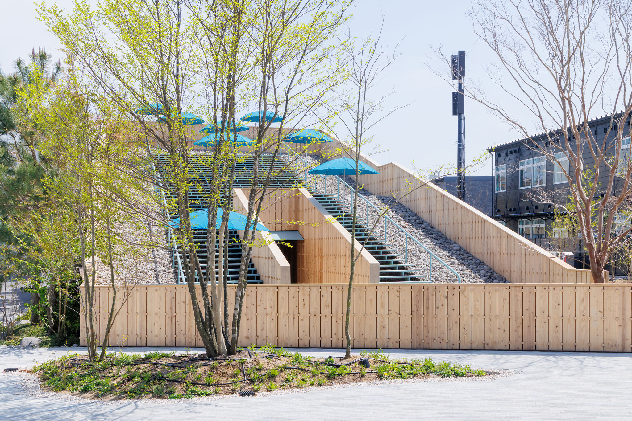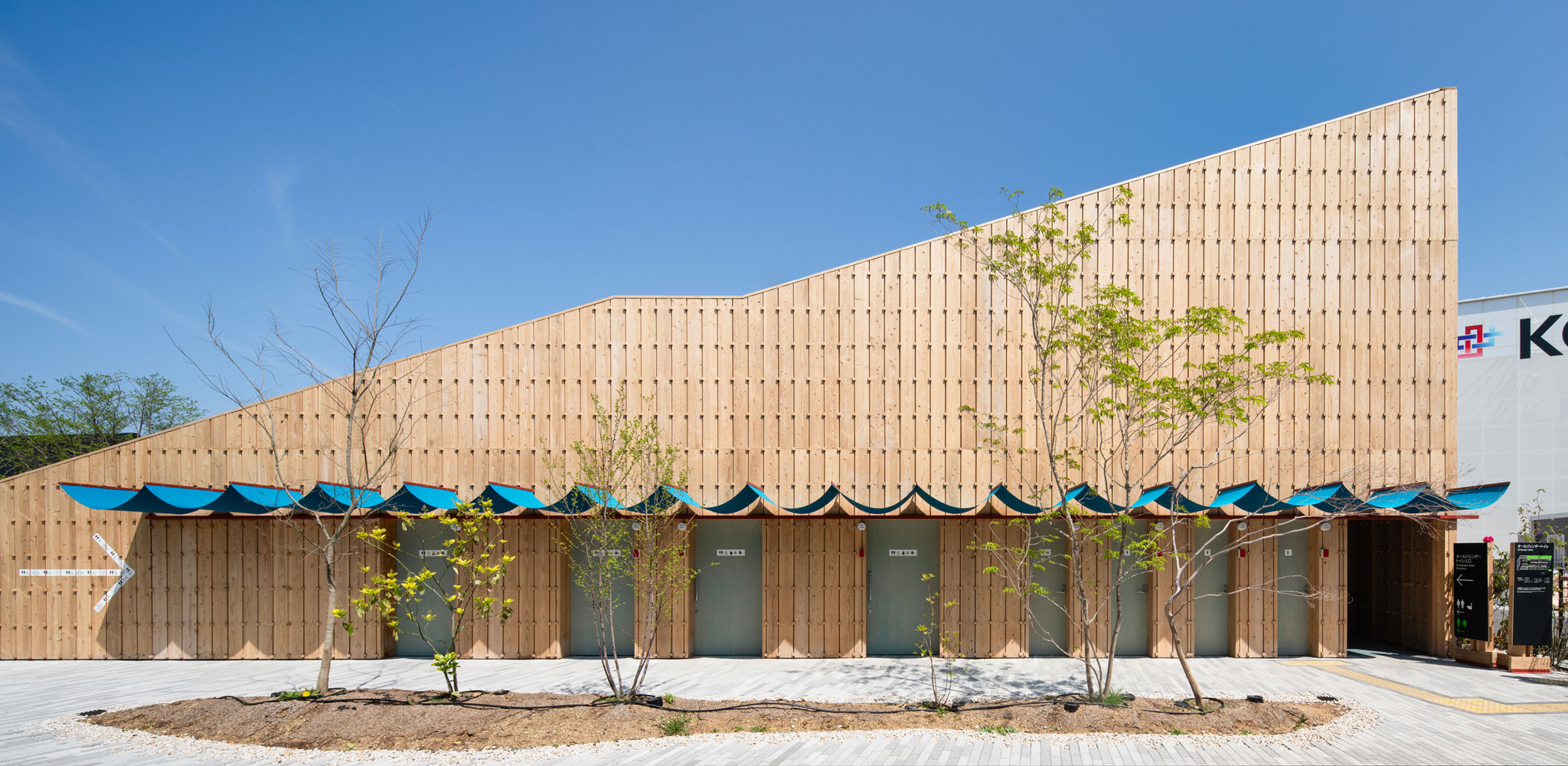 El pabellón de Kuma&Elsa plantea una experiencia diferente desde el primer instante. Se concibió como un espacio abierto, sin identidad de género, inspirado en la idea de que todos somos «peces que nadan en el mismo agua». La disposición del espacio permite abarcarlo de un solo vistazo, sin rincones ocultos, mientras la pendiente del edificio favorece la ventilación natural, llenando el ambiente con el suave aroma de la madera de cedro. El agua que fluye sobre la cubierta refleja, casi como un espejo, los movimientos de quienes transitan en su interior, integrando cuerpo y arquitectura en un diálogo constante.