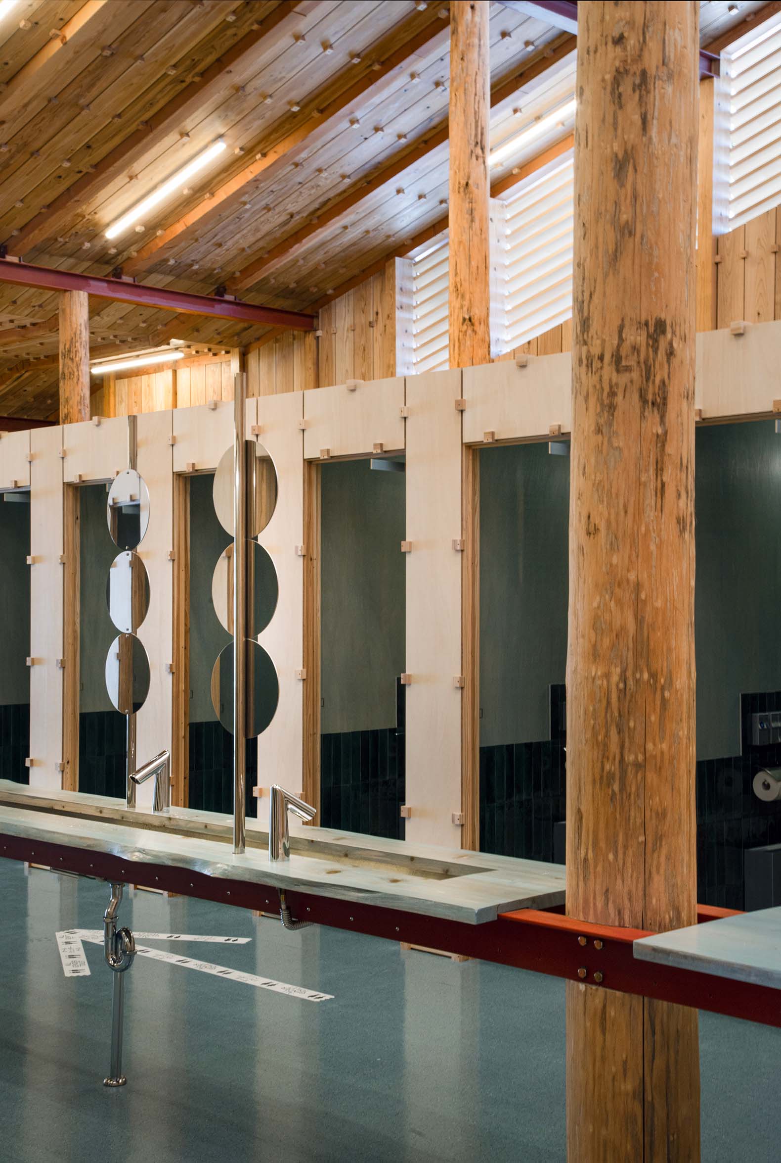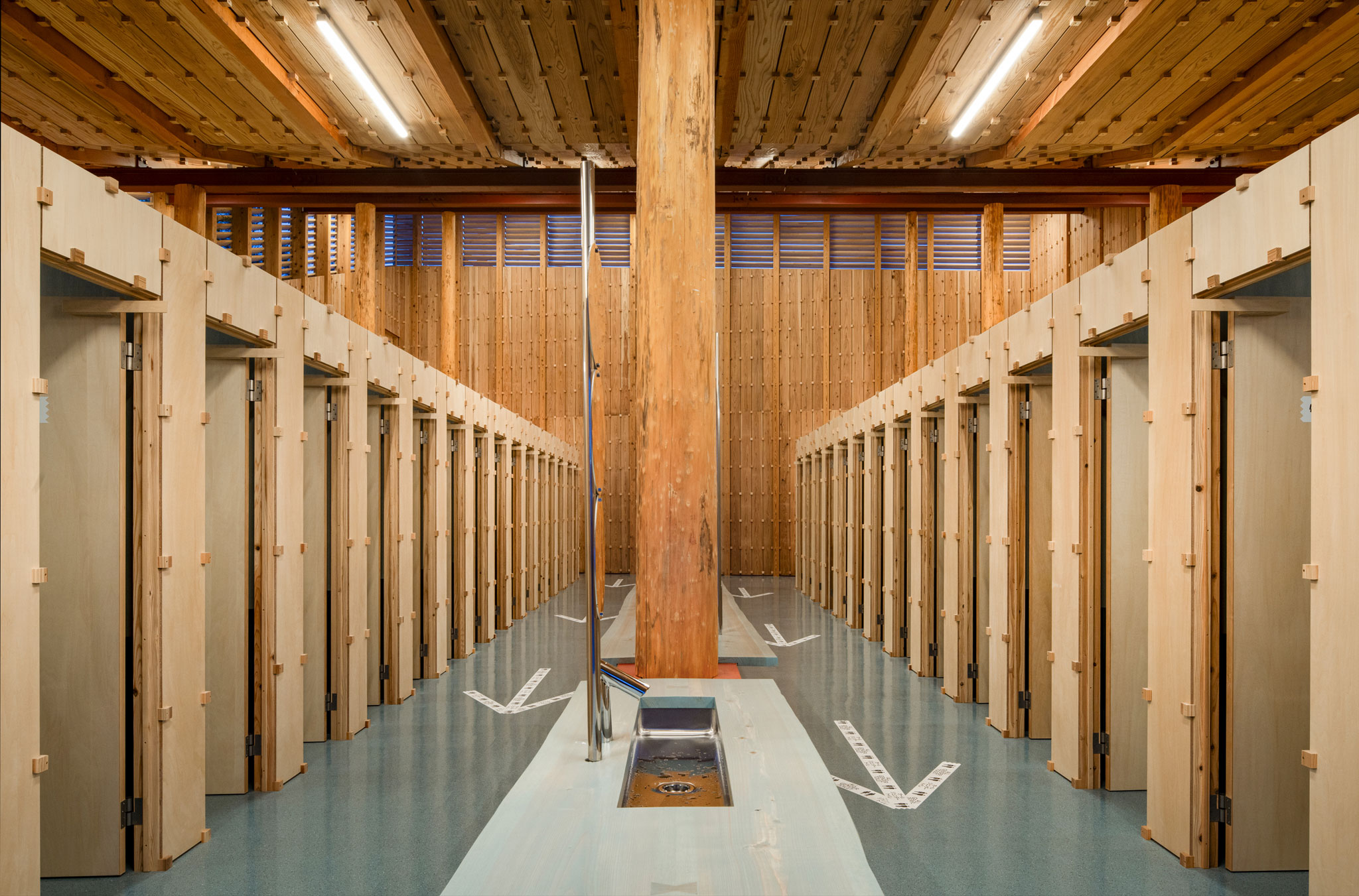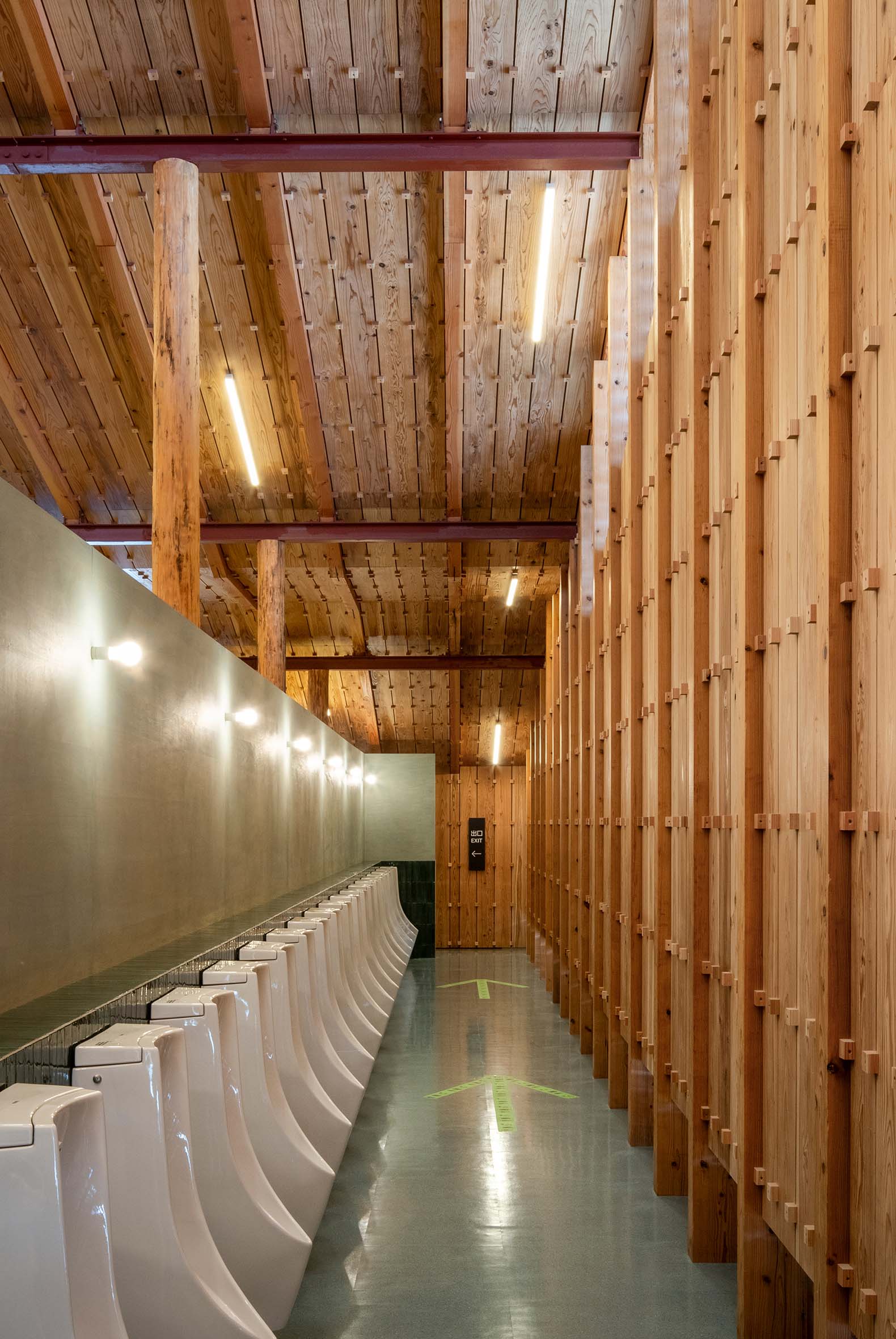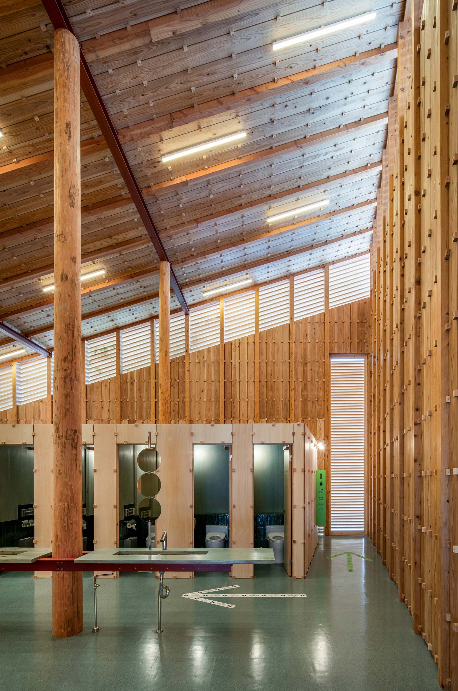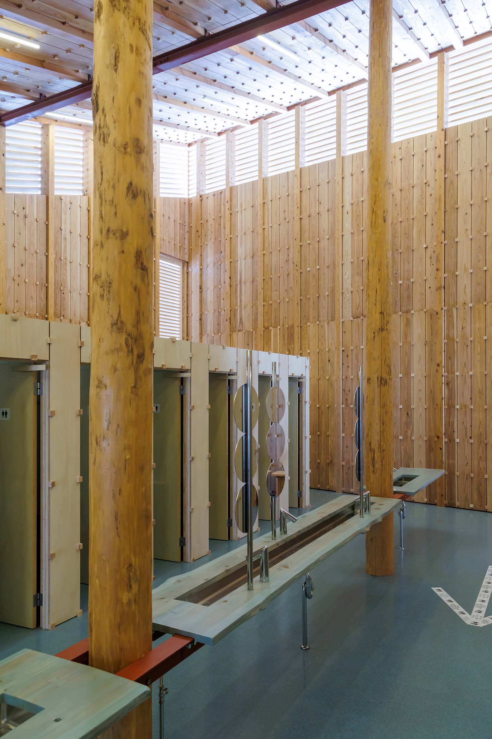 Somos, metafóricamente, todos peces nadando en la misma agua, por eso la mayoría de estos baños son para todos los géneros, sin distinción de edad ni de identidad. El espacio interior es completamente abierto, sin puntos ciegos. Así, de principio a fin del recorrido, todo el espacio puede ser abarcado en una sola mirada. La sección transversal triangular del edificio favorece la ventilación natural (ventilación por tiro), permitiendo que el aire caliente ascienda y que el aire fresco entre gracias a la brisa marina del suroeste. De esta manera el espacio interior se mantiene constantemente lleno de aire fresco, dejando solo el agradable aroma de la madera de cedro. El flujo de agua sobre el tejado refleja el movimiento de las personas dentro del pabellón.
