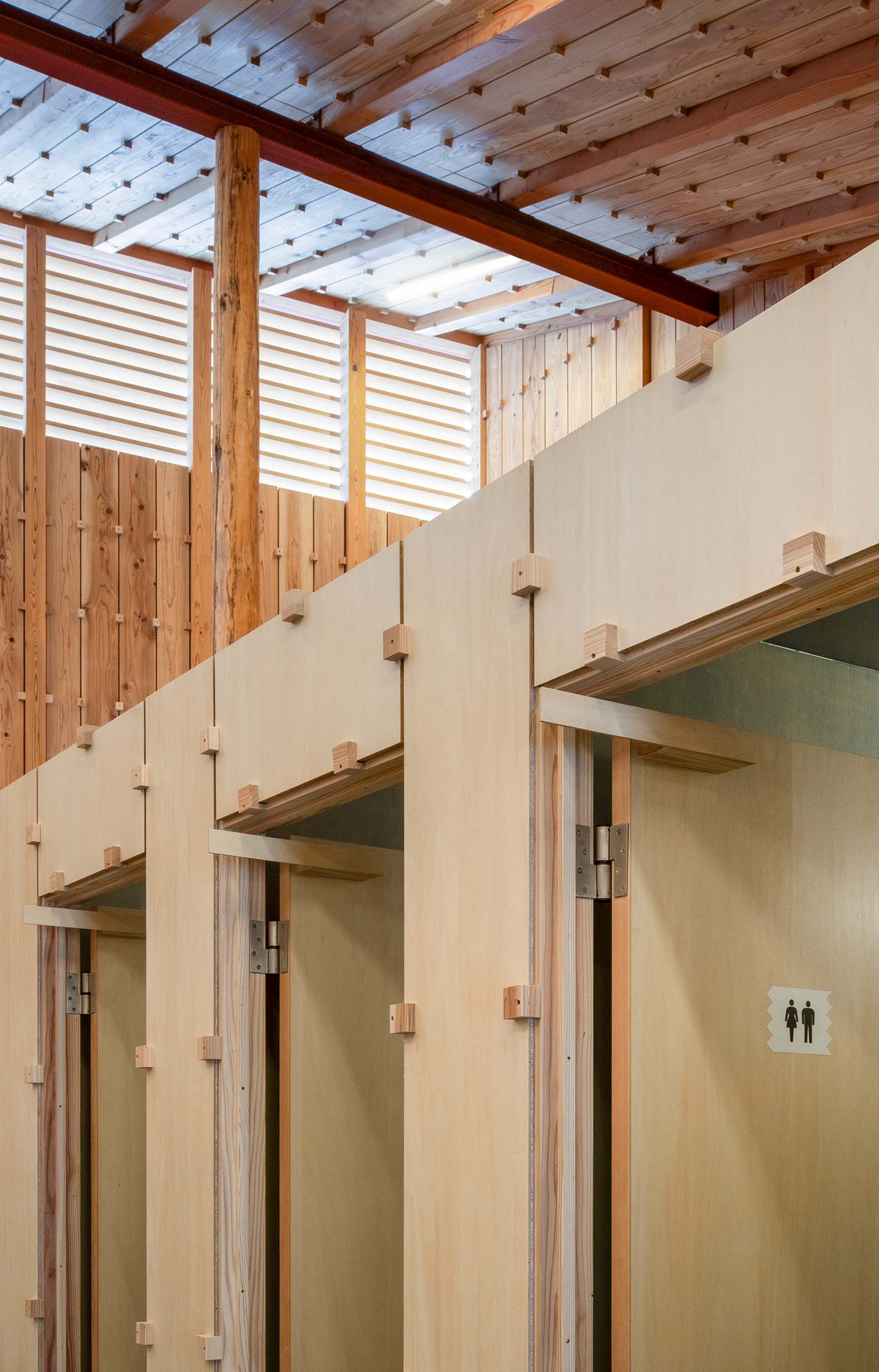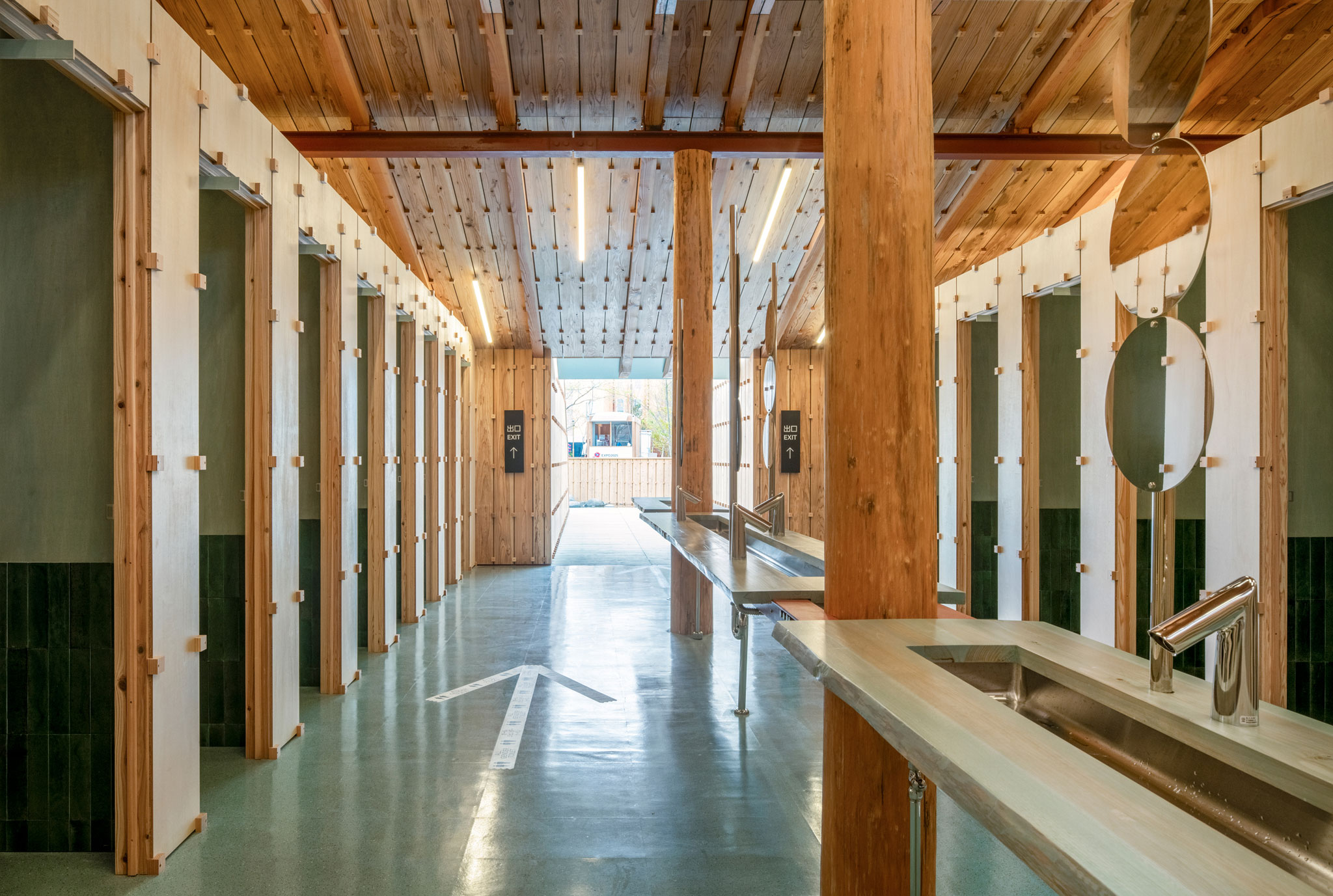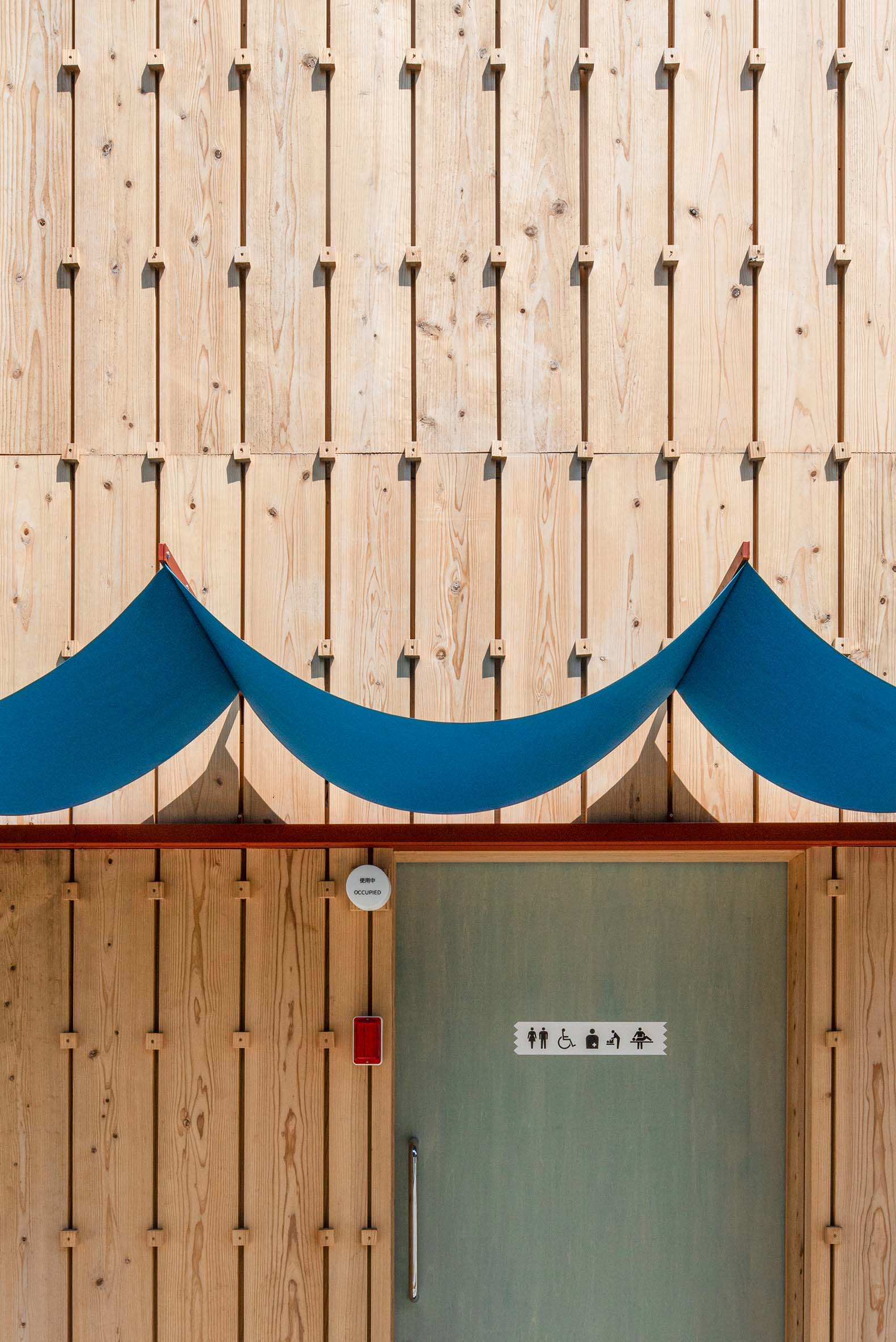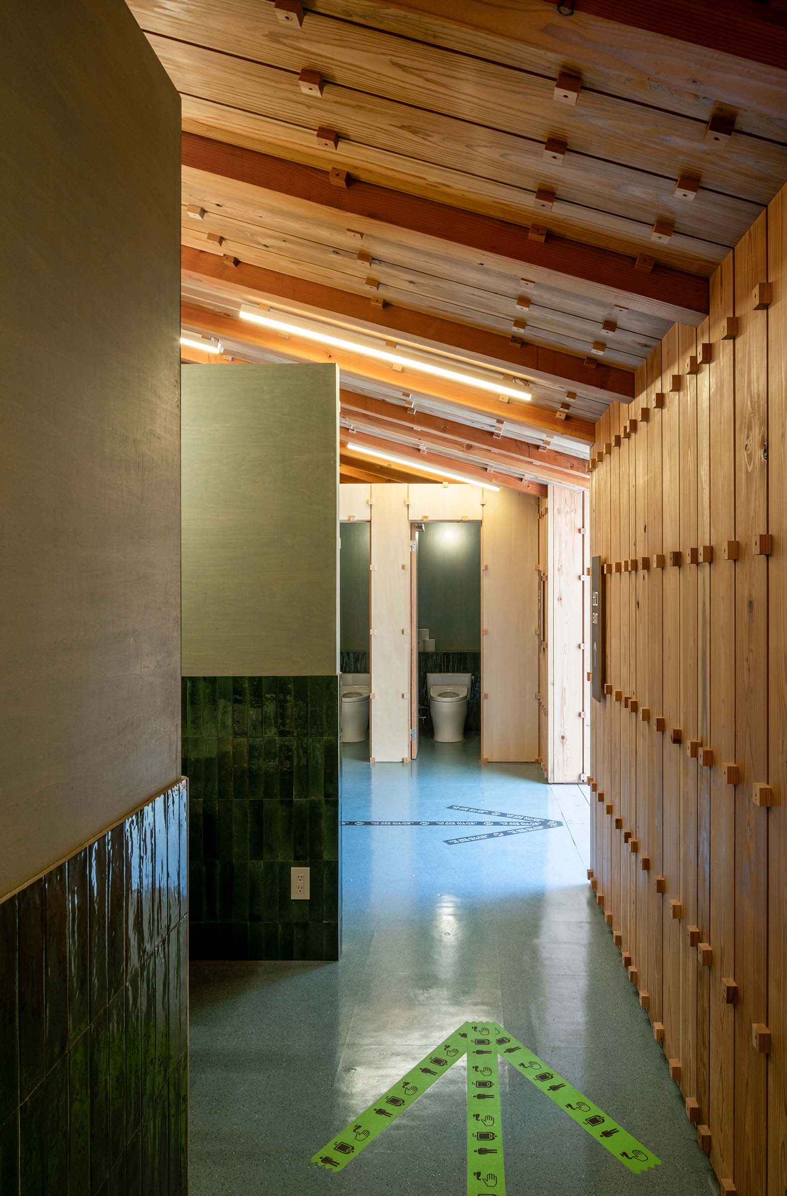 Somos, metafóricamente, todos peces nadando en la misma agua, por eso la mayoría de estos baños son para todos los géneros, sin distinción de edad ni de identidad. El espacio interior es completamente abierto, sin puntos ciegos. Así, de principio a fin del recorrido, todo el espacio puede ser abarcado en una sola mirada. La sección transversal triangular del edificio favorece la ventilación natural (ventilación por tiro), permitiendo que el aire caliente ascienda y que el aire fresco entre gracias a la brisa marina del suroeste. De esta manera el espacio interior se mantiene constantemente lleno de aire fresco, dejando solo el agradable aroma de la madera de cedro. El flujo de agua sobre el tejado refleja el movimiento de las personas dentro del pabellón.