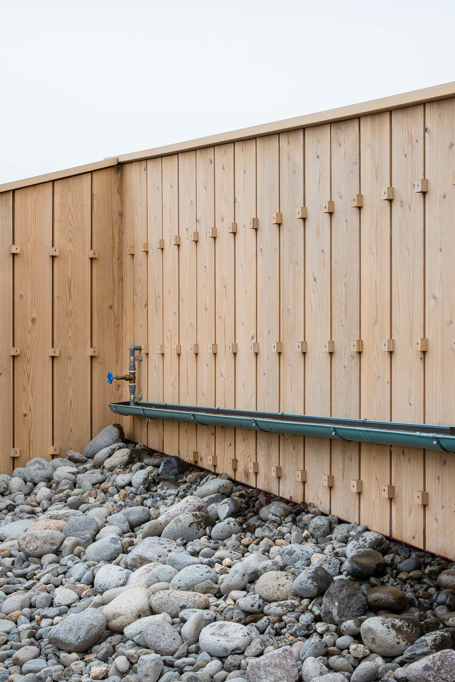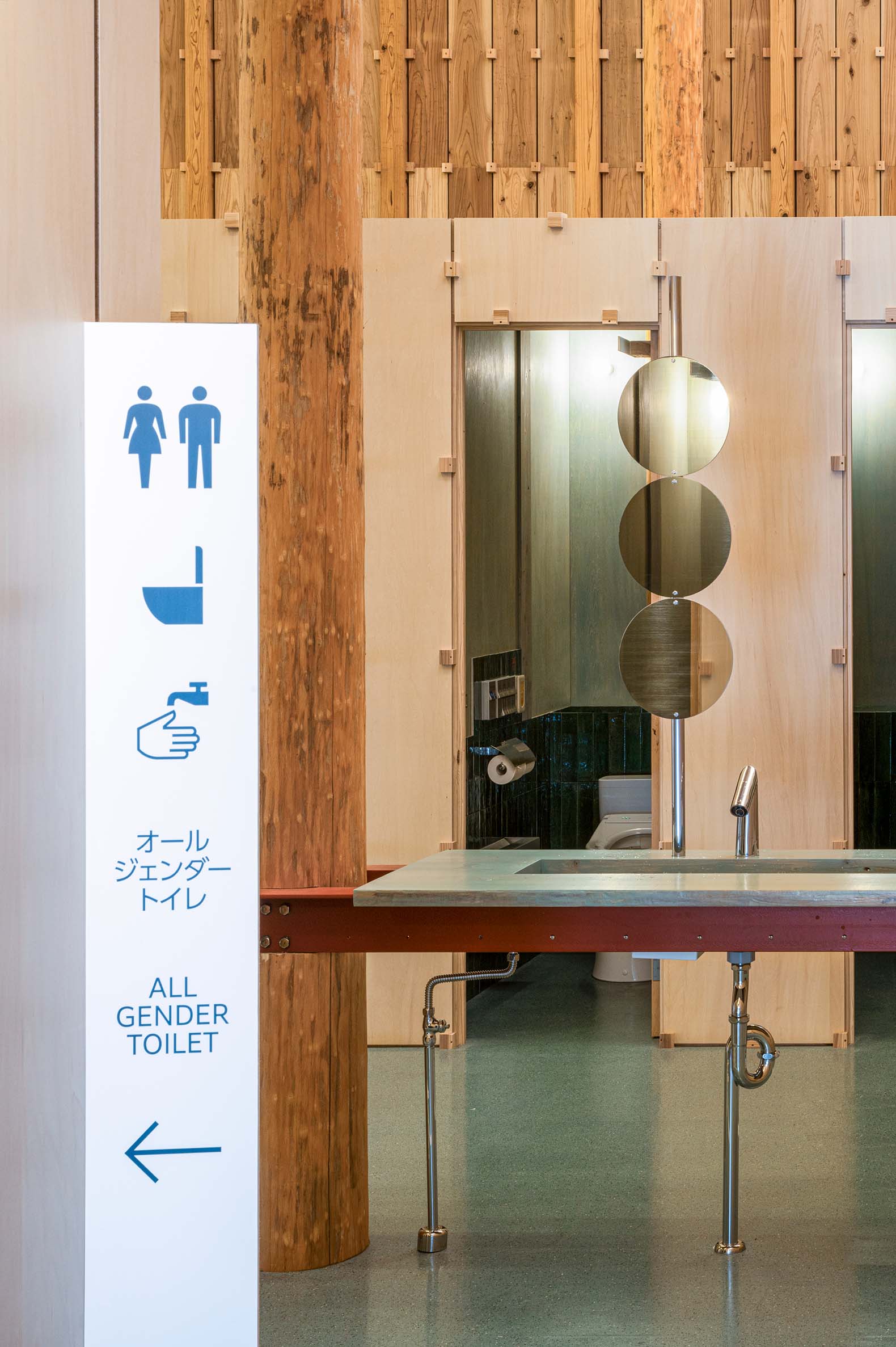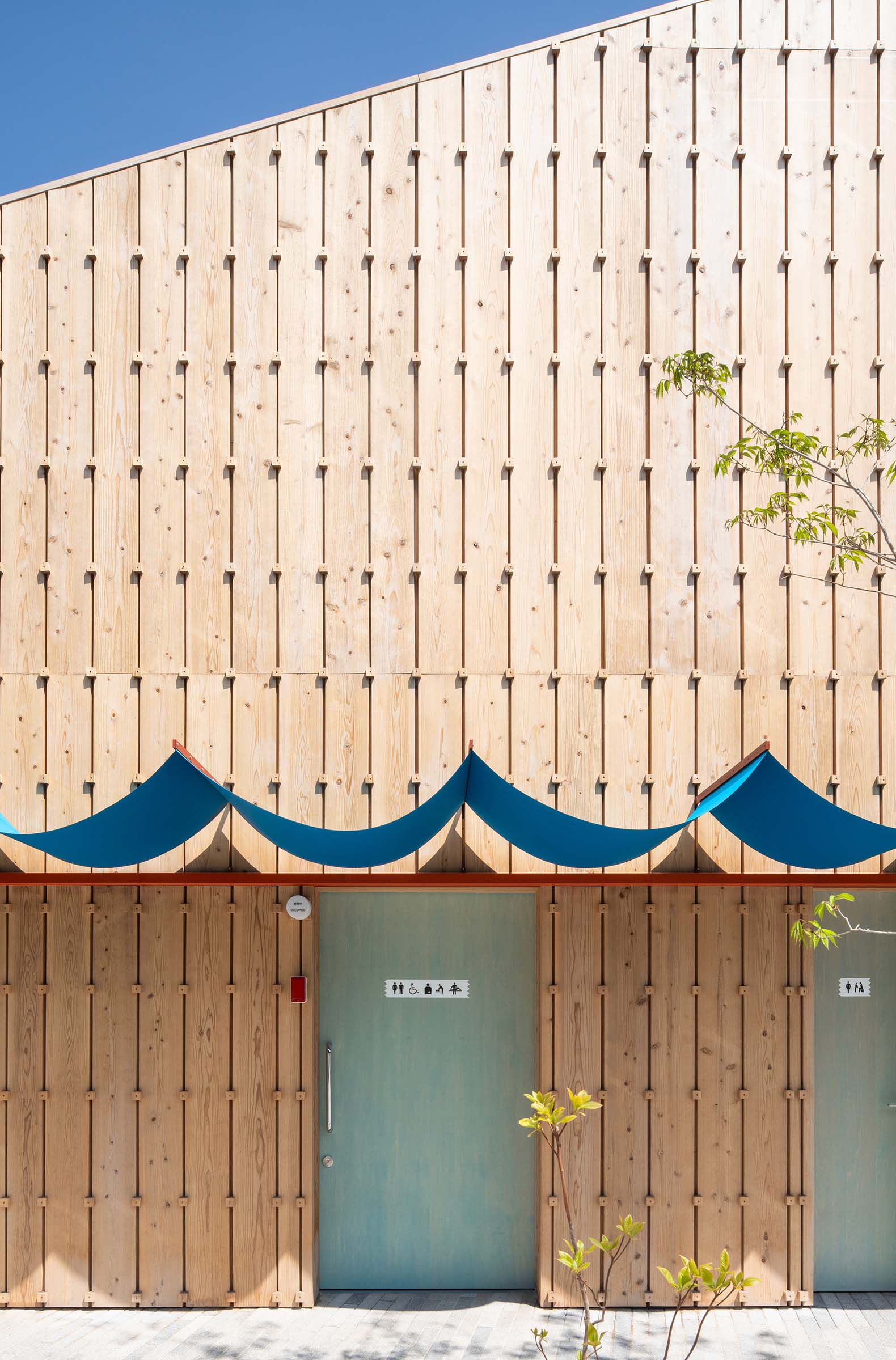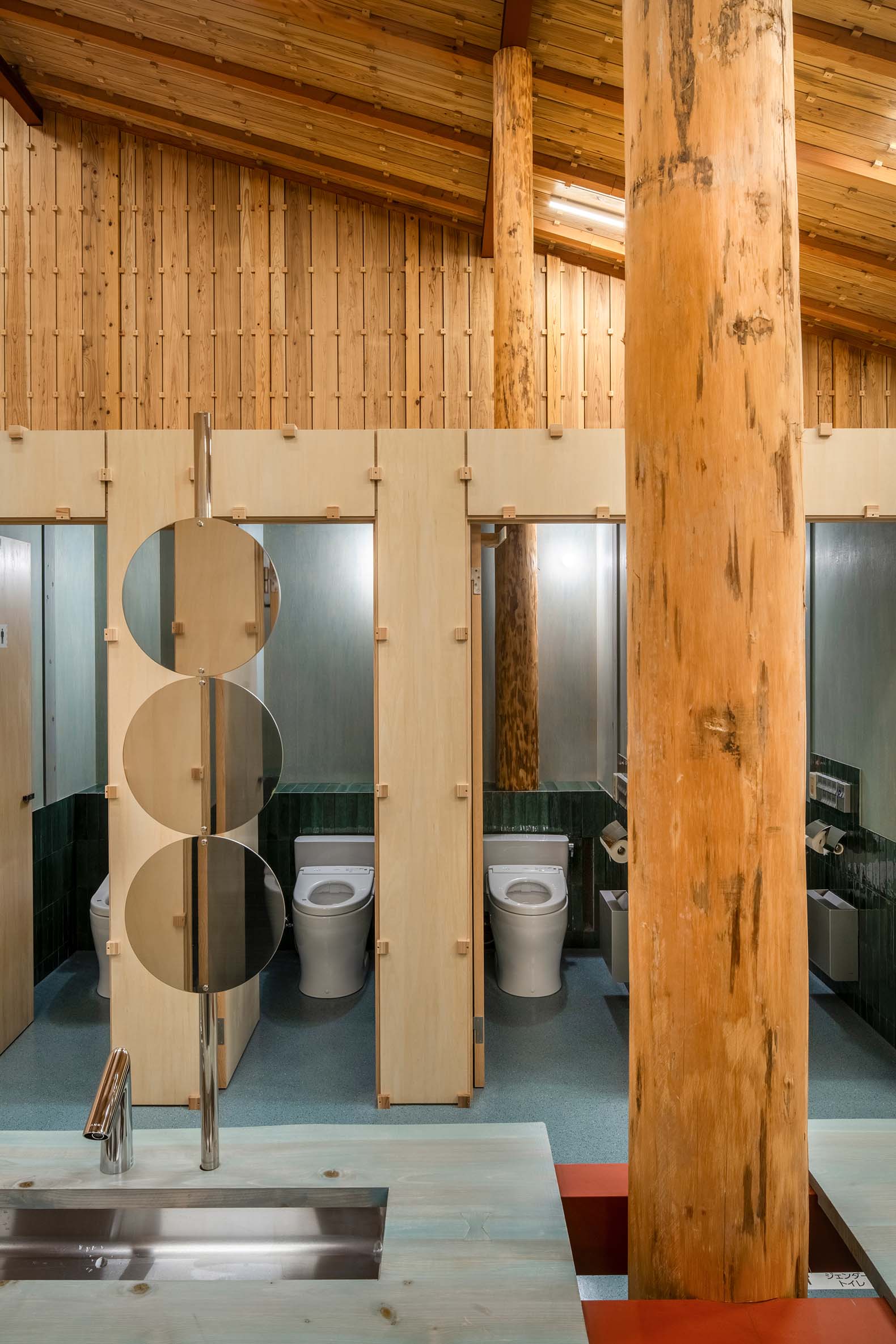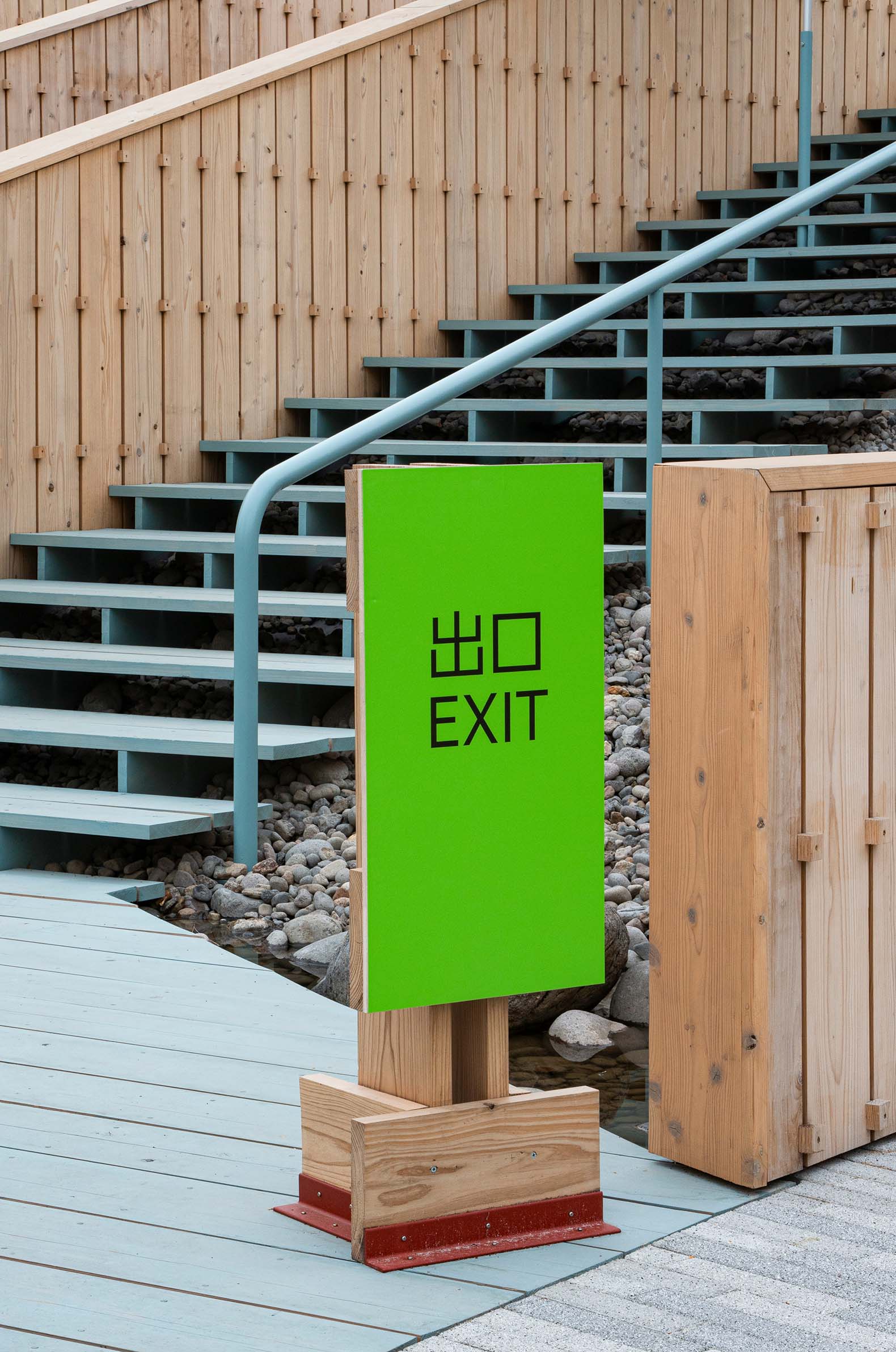 Somos, metafóricamente, todos peces nadando en la misma agua, por eso la mayoría de estos baños son para todos los géneros, sin distinción de edad ni de identidad. El espacio interior es completamente abierto, sin puntos ciegos. Así, de principio a fin del recorrido, todo el espacio puede ser abarcado en una sola mirada. La sección transversal triangular del edificio favorece la ventilación natural (ventilación por tiro), permitiendo que el aire caliente ascienda y que el aire fresco entre gracias a la brisa marina del suroeste. De esta manera el espacio interior se mantiene constantemente lleno de aire fresco, dejando solo el agradable aroma de la madera de cedro. El flujo de agua sobre el tejado refleja el movimiento de las personas dentro del pabellón.