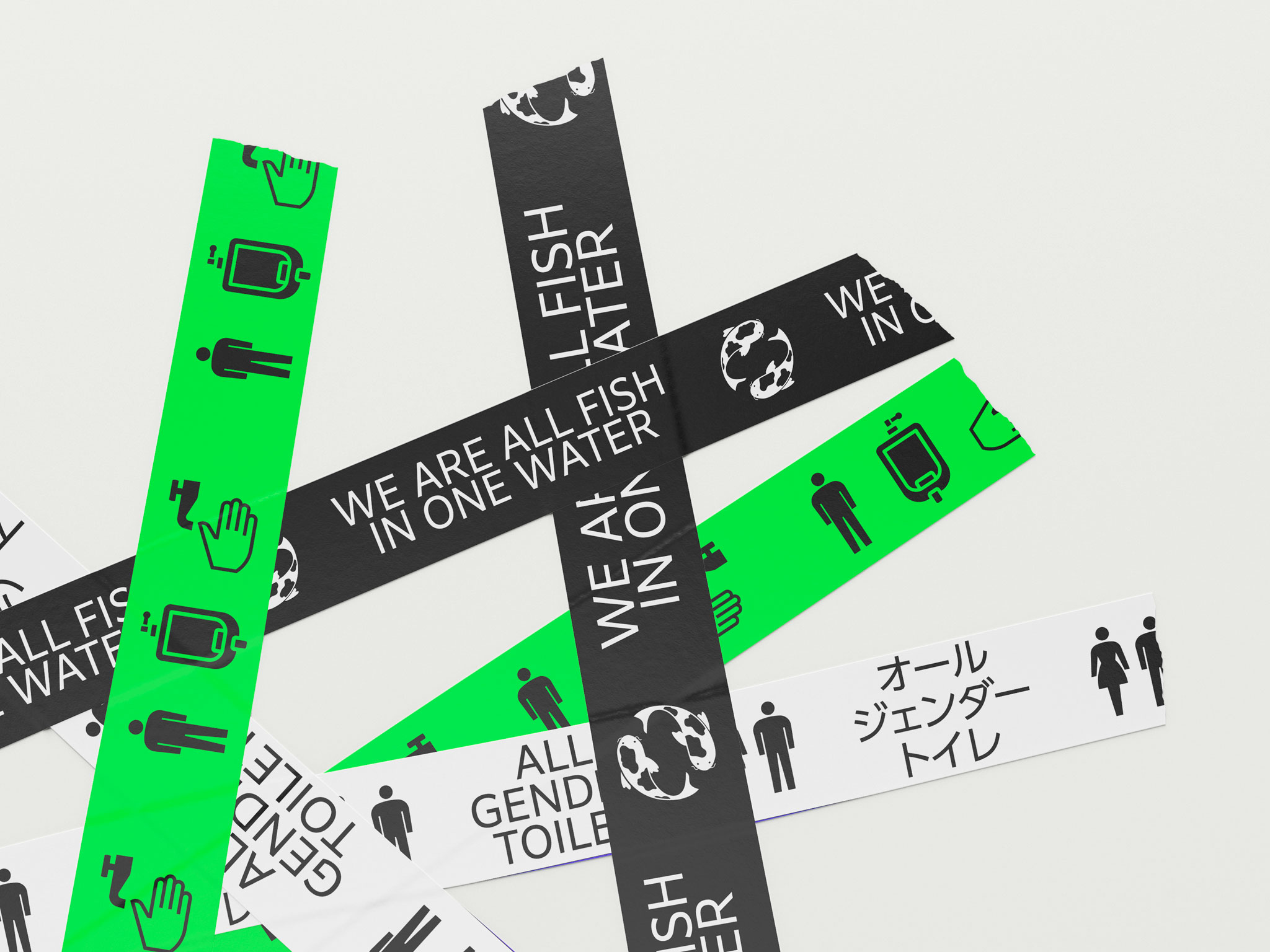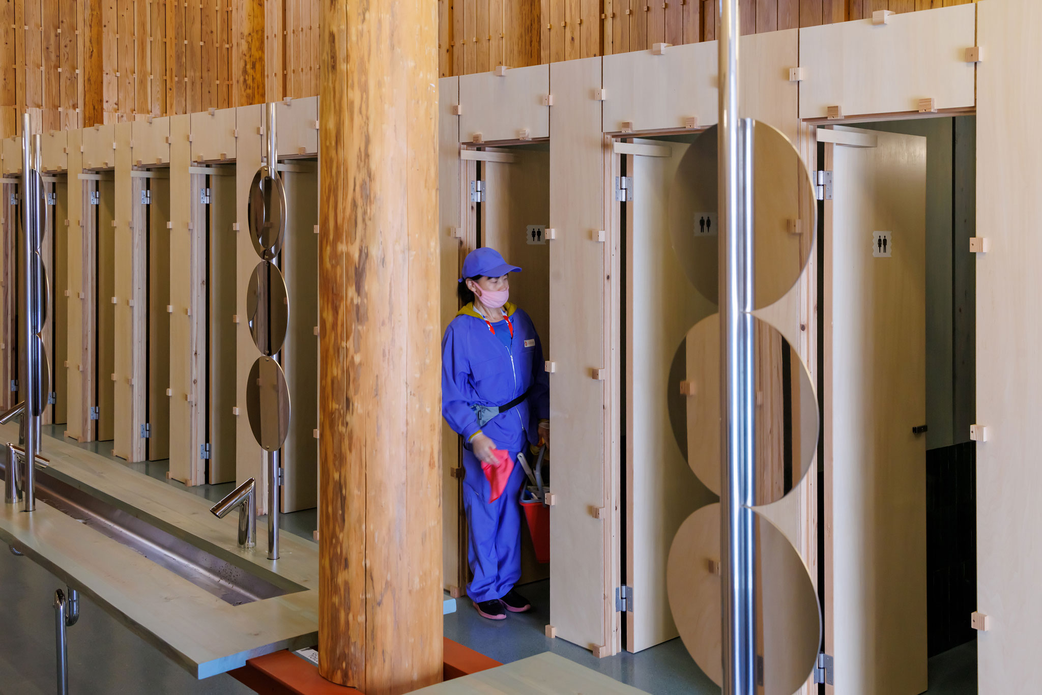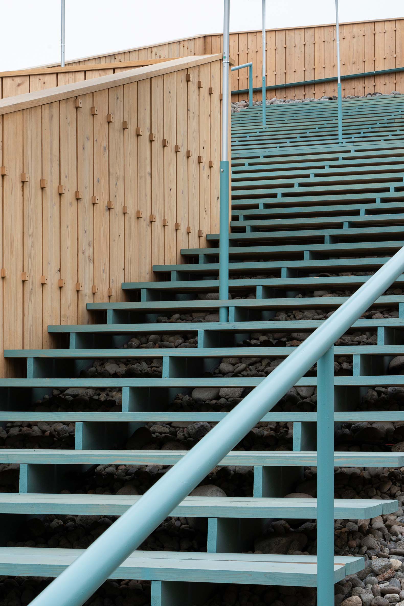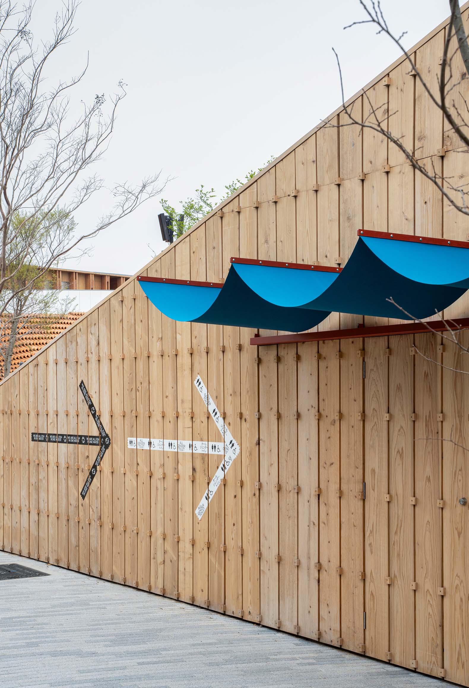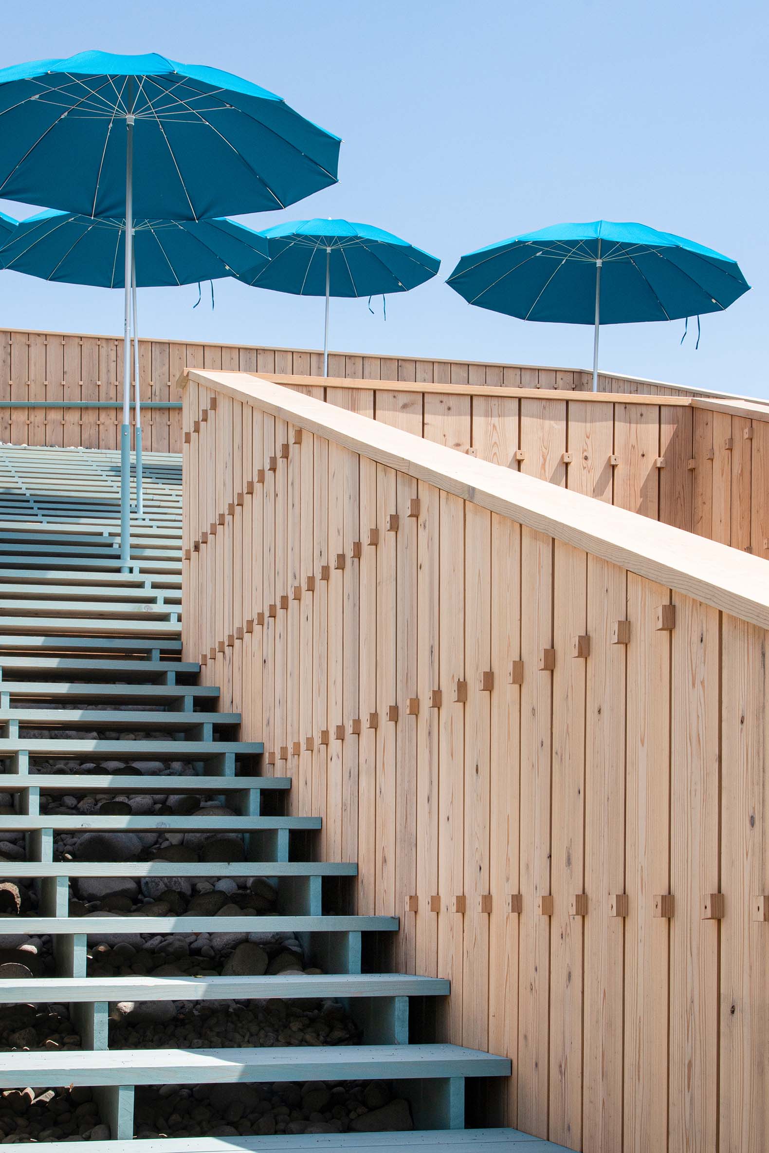 Somos, metafóricamente, todos peces nadando en la misma agua, por eso la mayoría de estos baños son para todos los géneros, sin distinción de edad ni de identidad. El espacio interior es completamente abierto, sin puntos ciegos. Así, de principio a fin del recorrido, todo el espacio puede ser abarcado en una sola mirada. La sección transversal triangular del edificio favorece la ventilación natural (ventilación por tiro), permitiendo que el aire caliente ascienda y que el aire fresco entre gracias a la brisa marina del suroeste. De esta manera el espacio interior se mantiene constantemente lleno de aire fresco, dejando solo el agradable aroma de la madera de cedro. El flujo de agua sobre el tejado refleja el movimiento de las personas dentro del pabellón.