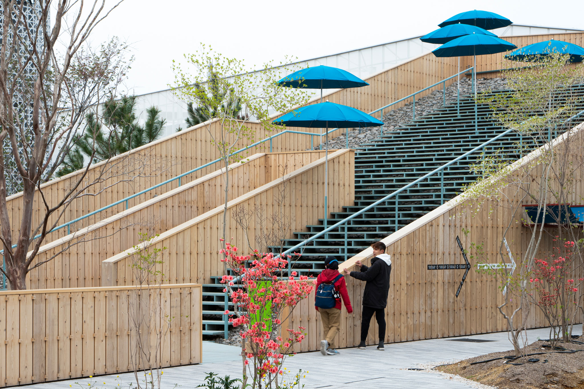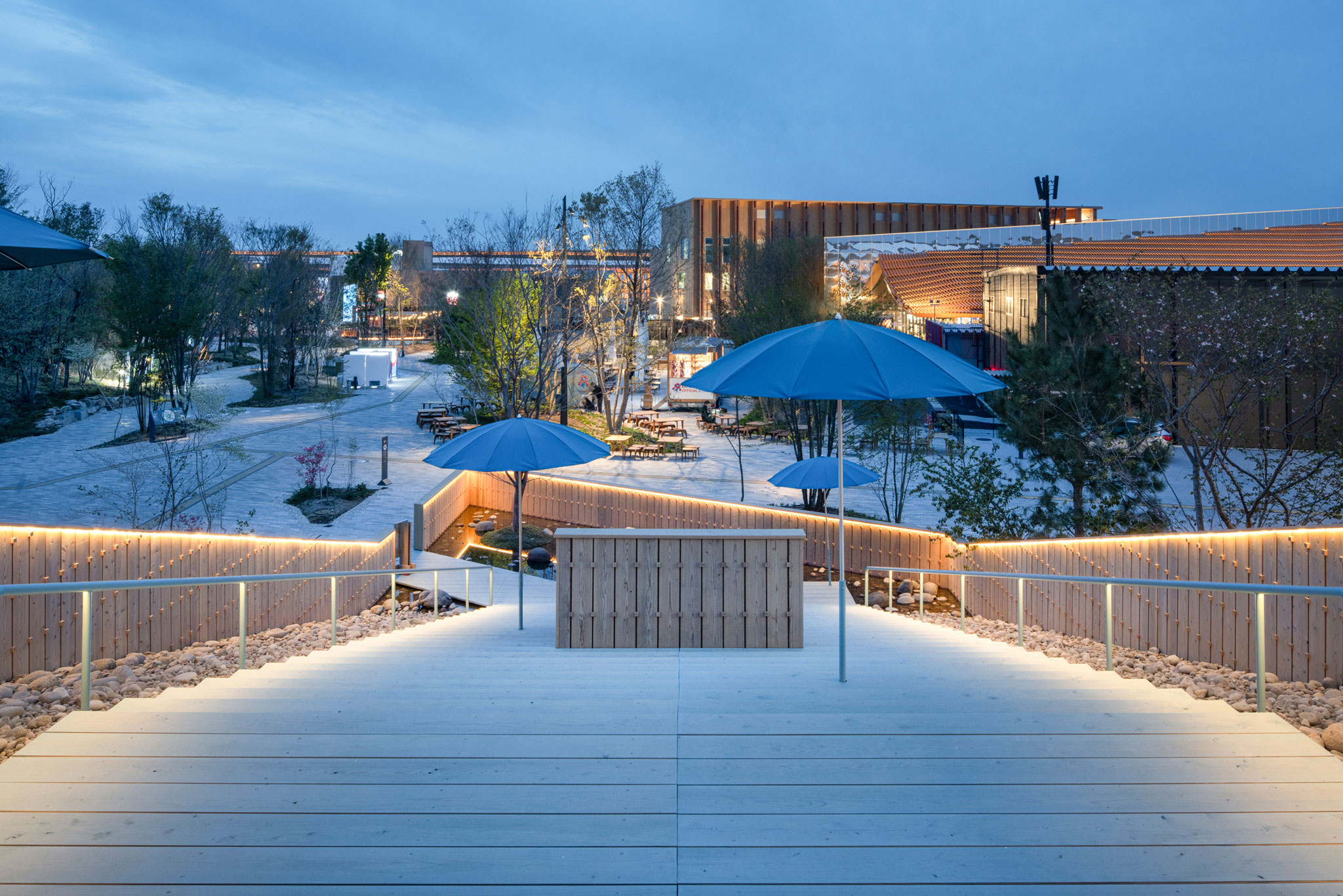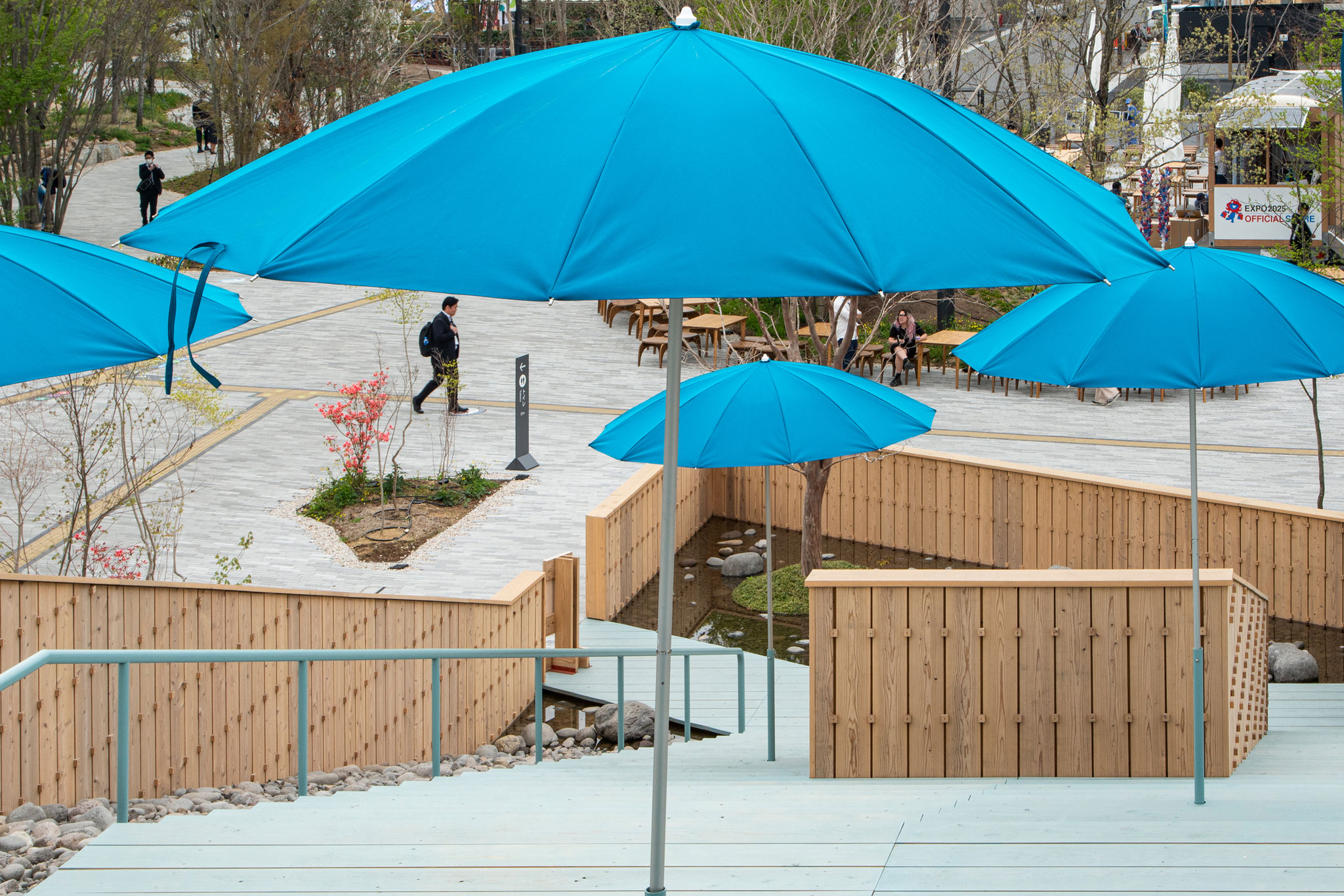 La cubierta escalonada ofrece una vista del bosque central de la Exposición Universal. La mirada sigue naturalmente la dirección del agua que fluye — y más allá se avista el bosque, nutrido por este mismo ciclo del agua.