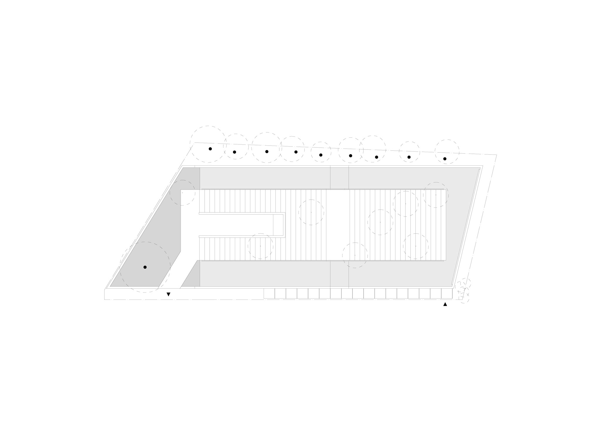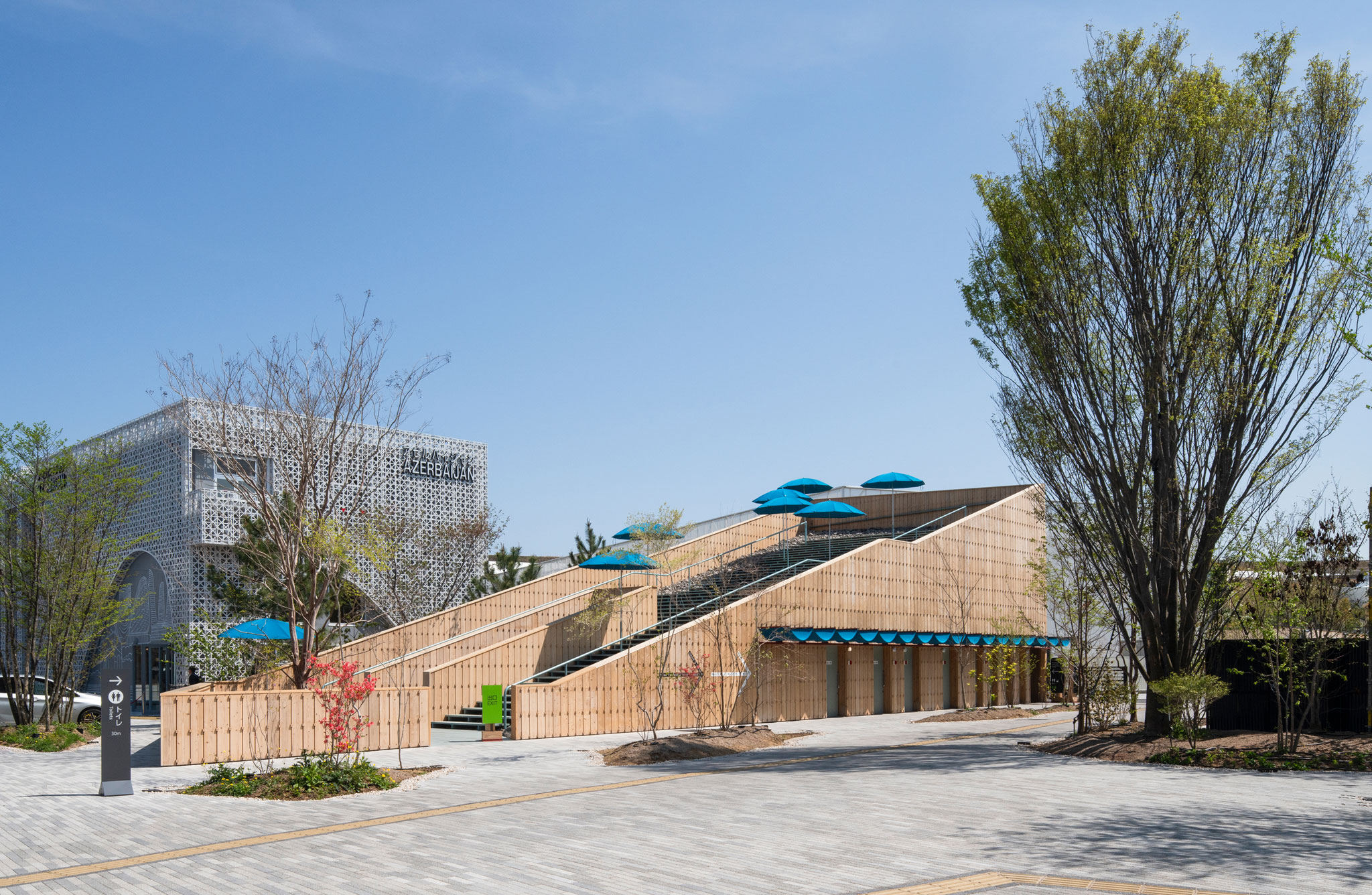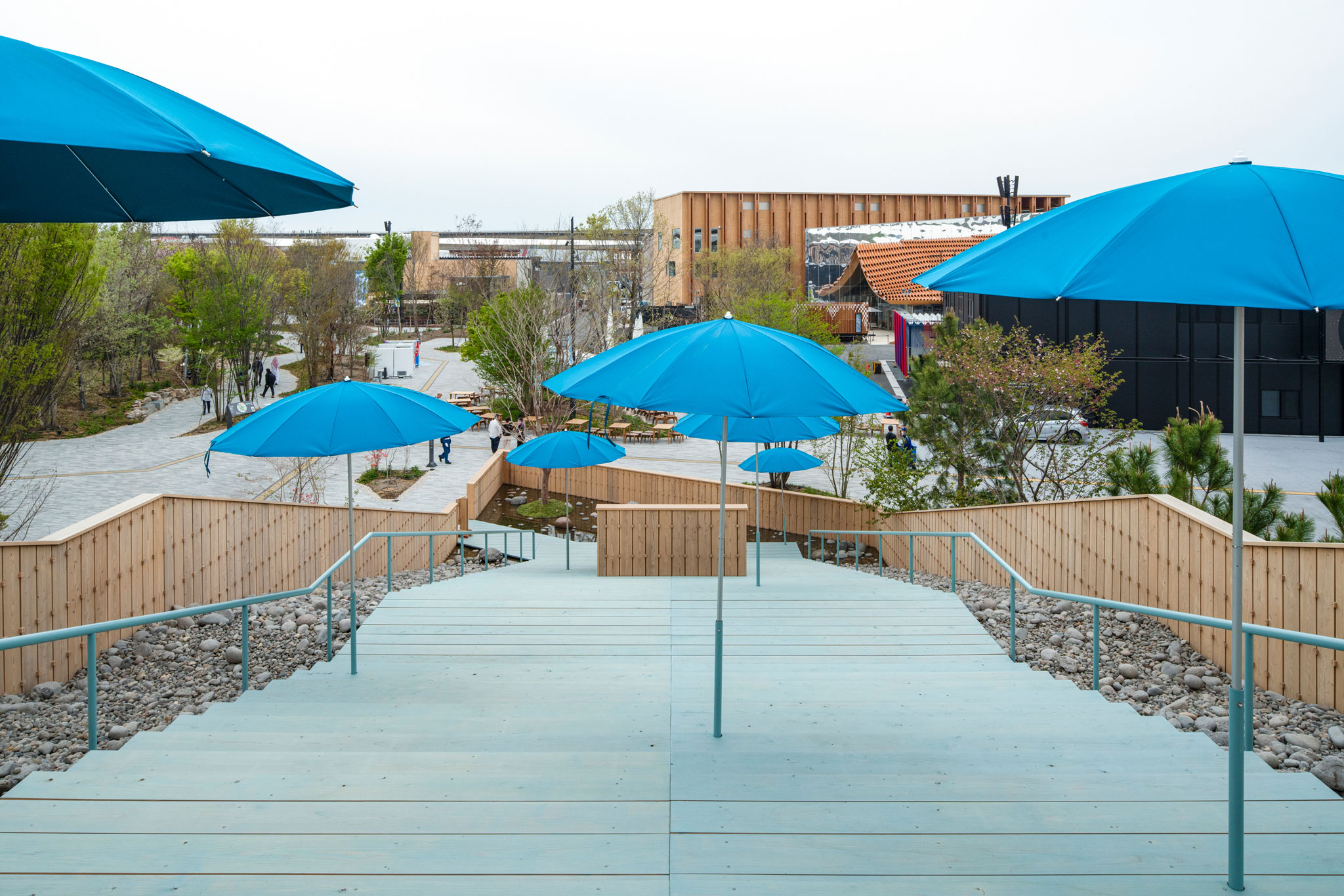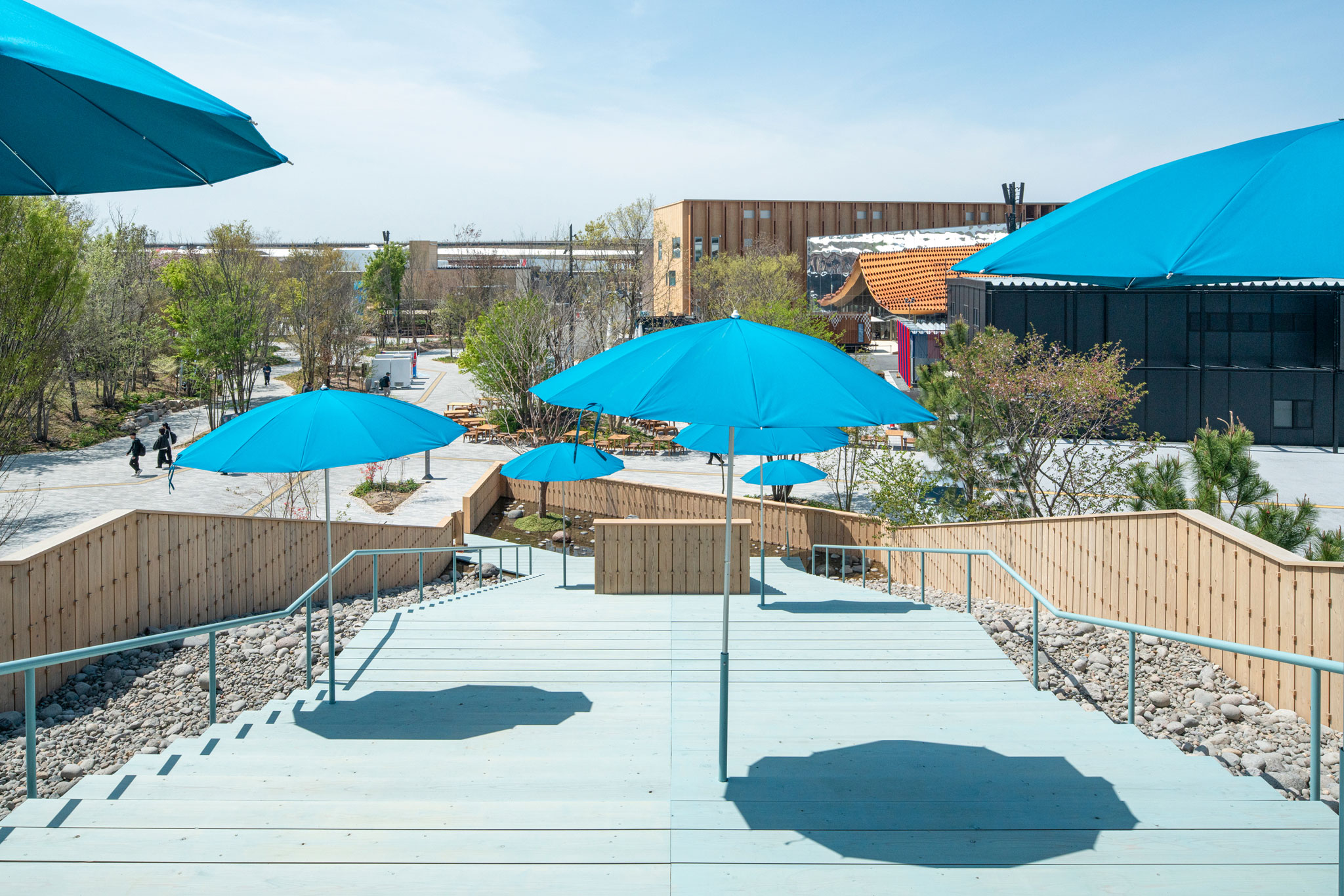 La cubierta escalonada ofrece una vista del bosque central de la Exposición Universal. La mirada sigue naturalmente la dirección del agua que fluye — y más allá se avista el bosque, nutrido por este mismo ciclo del agua.