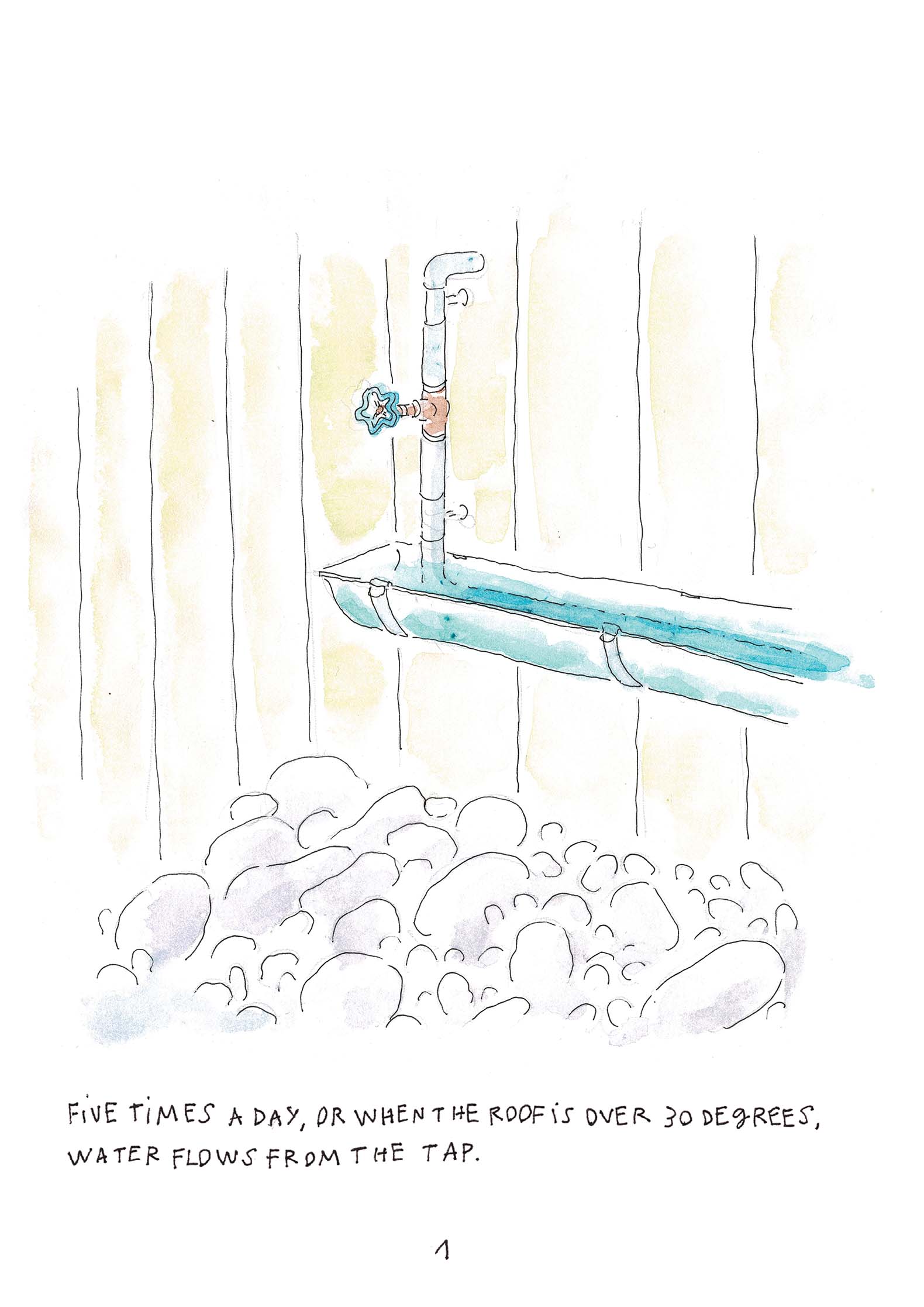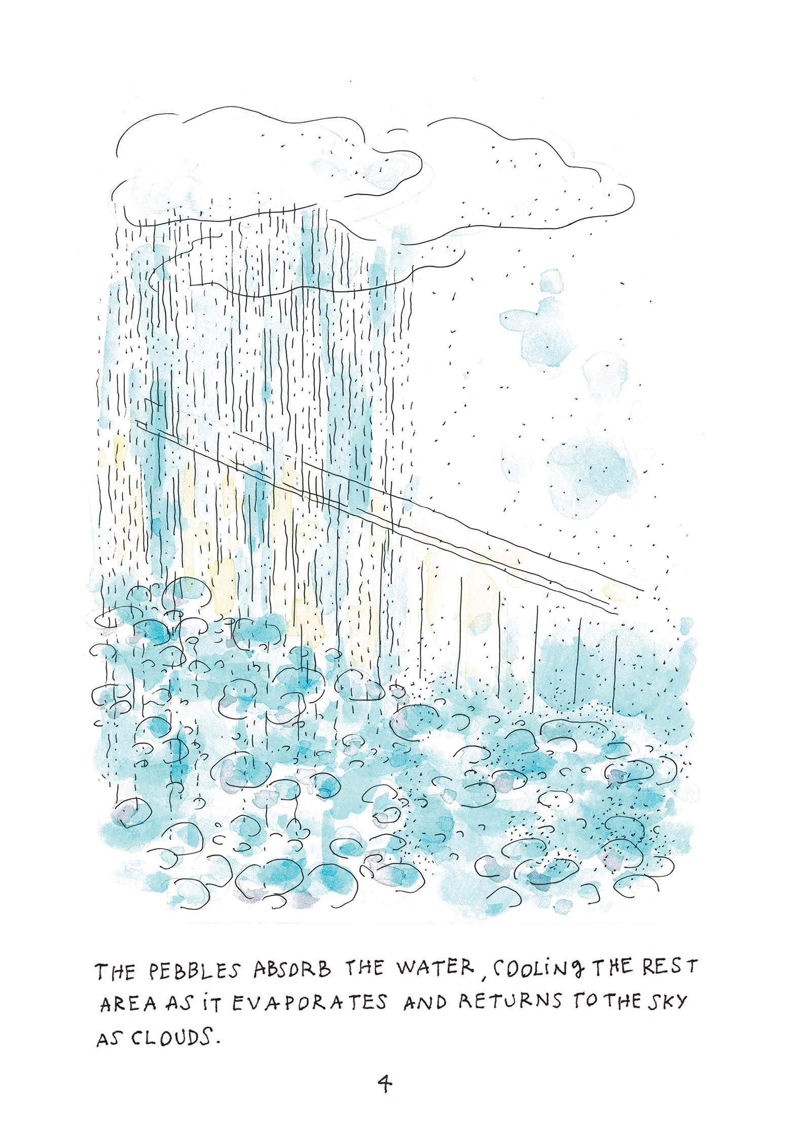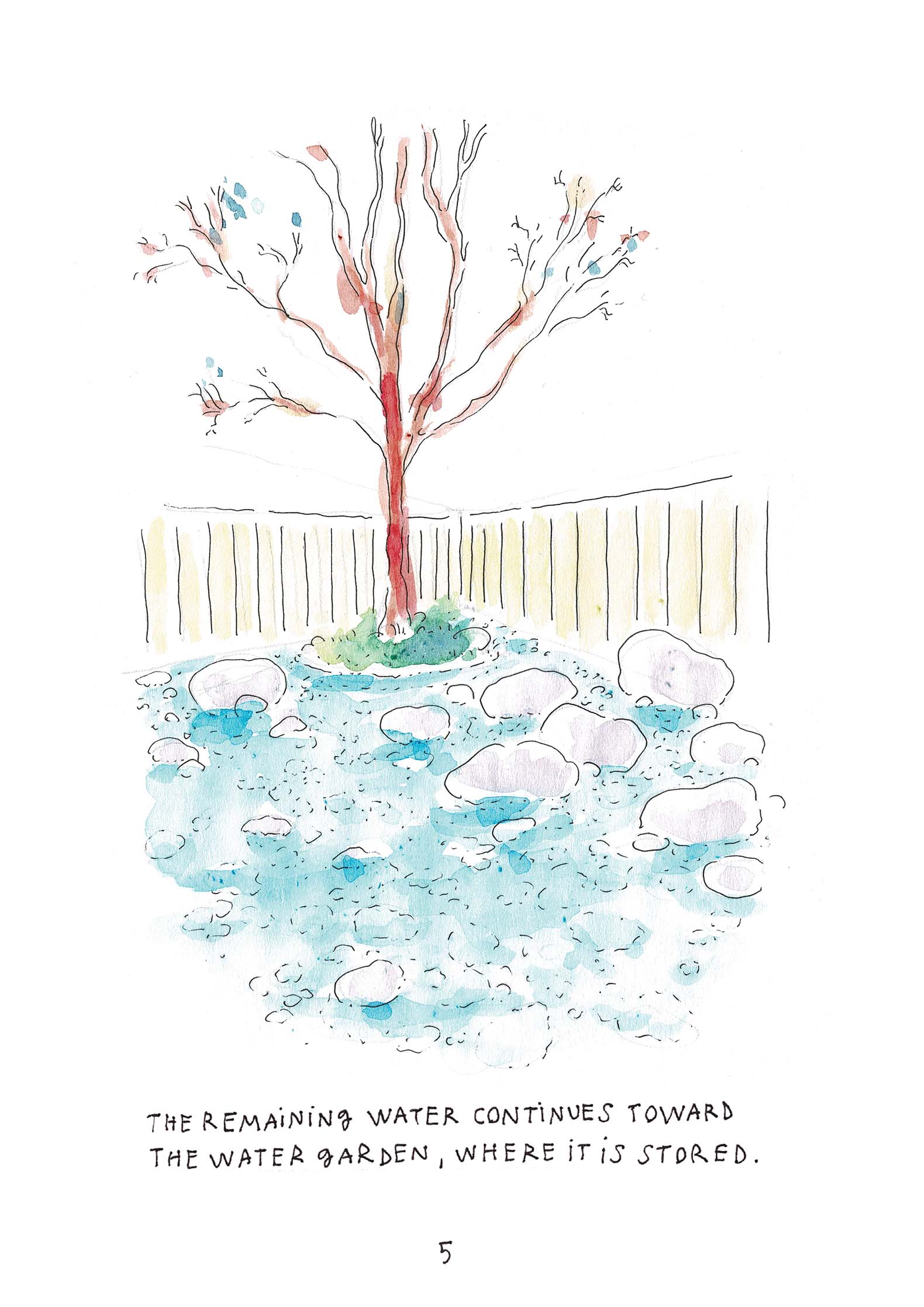 Al final del recorrido, el camino lleva a un jardín de agua donde se recoge y almacena el agua de lluvia. Este agua se reutiliza para abastecer los baños y regar el tejado. Los cantos rodados sobre la cubierta absorben el agua y la enfrían por evaporación. El vapor asciende, forma nubes y vuelve a caer como lluvia.