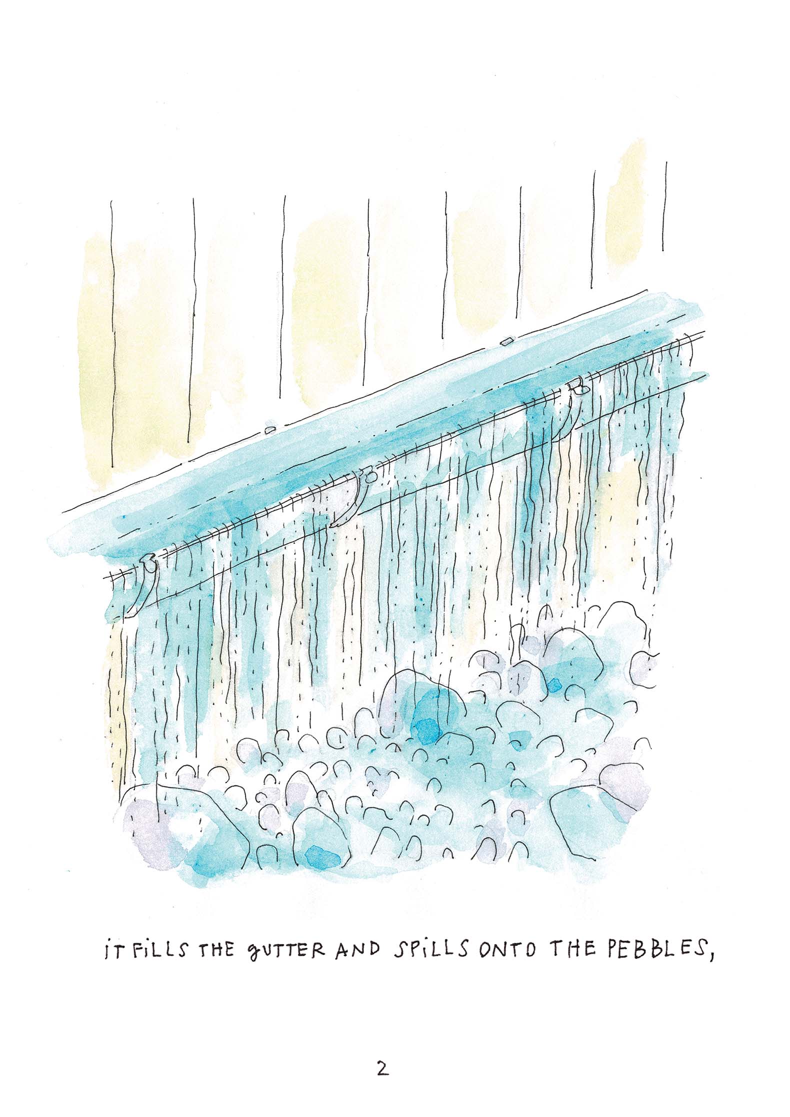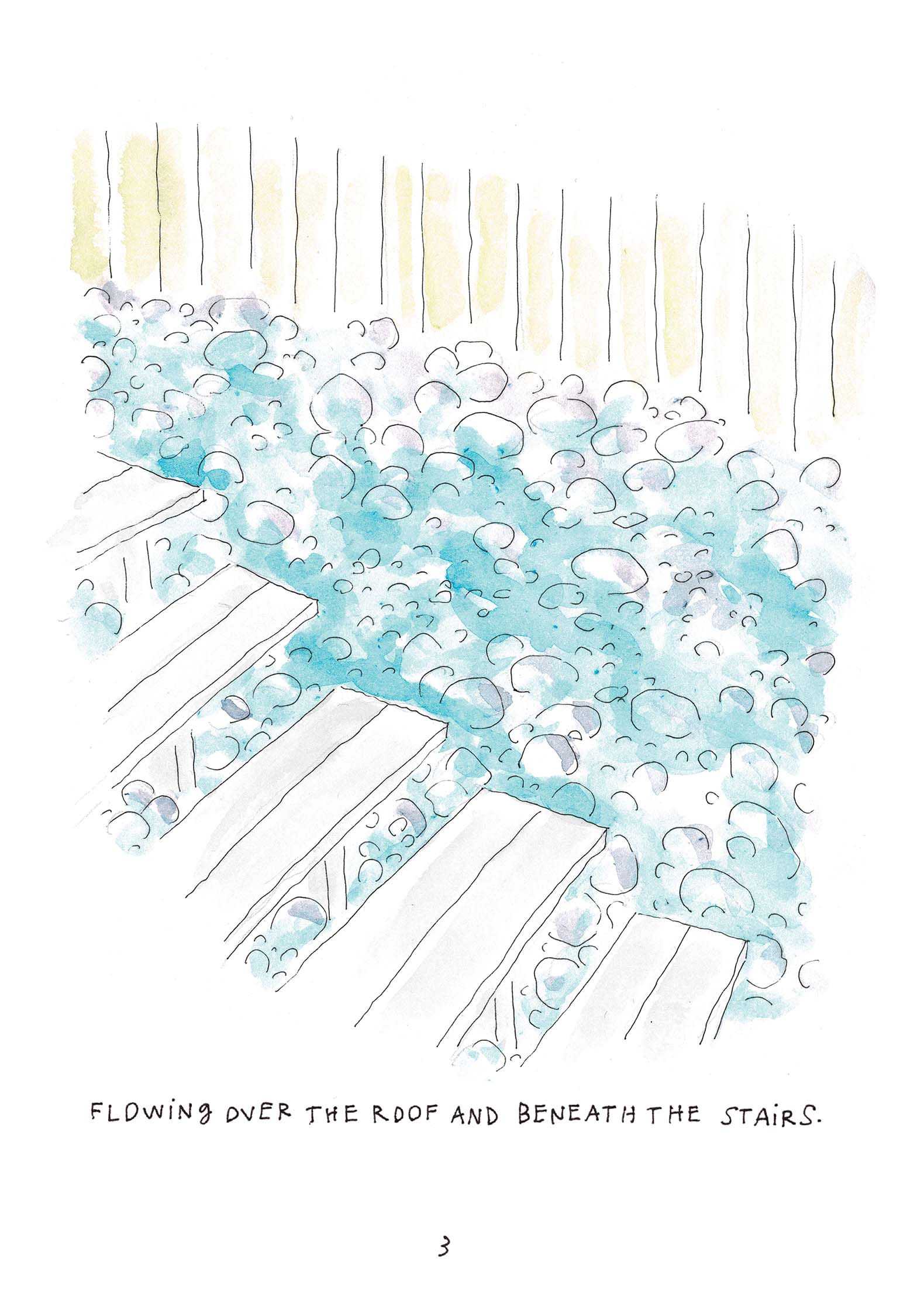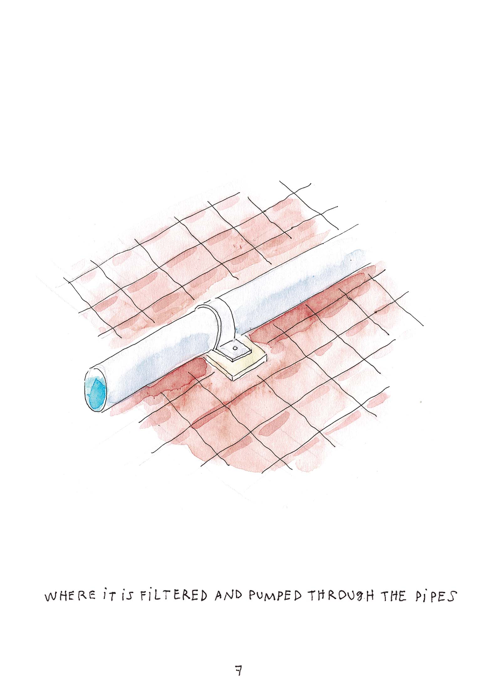 Al final del recorrido, el camino lleva a un jardín de agua donde se recoge y almacena el agua de lluvia. Este agua se reutiliza para abastecer los baños y regar el tejado. Los cantos rodados sobre la cubierta absorben el agua y la enfrían por evaporación. El vapor asciende, forma nubes y vuelve a caer como lluvia.
