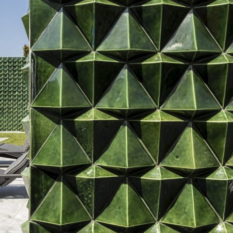 Se aplicaron tejas verdes tridimensionales hechas a mano para revestir la piscina, la barbacoa, el garaje / lavadero y el baño que, al ocultar esos volúmenes, proporcionan una relación equilibrada con el entorno verde natural. De la misma forma, la ampliación existente de la casa en el nivel inferior fue revestida con el mismo material, unificando así sus diversas partes en torno a un motivo común.
