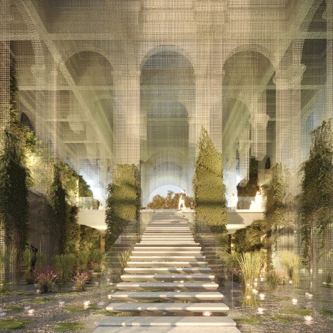 El pedestal se eleva gradualmente en altura, formando un armazón de material que guarda celosamente el jardín, haciéndolo visible solo en parte desde el exterior, y colocándose debajo de las majestuosas estructuras de malla metálica transparente que evocan los ambientes y bóvedas de patios y palacios italianos. La fusión entre los elementos maternos y etéreos da vida a los grandes espacios centrales, el Prólogo y la Plaza, que, impregnados por el agua y el jardín, elementos clave de la gran tradición de los jardines italianos, constituyen el objetivo evocador y funcional de proyecto.
