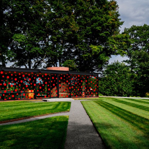 La Casa de Cristal también acogió la enorme instalación de acero que Kusama creó recientemente, CALABAZA [PUMPKIN] (2015). La colocación de PUMPKIN se hizo en el prado de la ladera, al este-noreste de la Casa de Ladrillo (1949), en una base de hormigón en la que se instaló la escultura Curva II [Curve II] de Ellsworth Kelly (1973). "La primera vez que vi una calabaza fue en una granja en la escuela primaria. En japonés, una "cabeza de calabaza" es un hombre ignorante o una mujer rechoncha, pero yo estoy fascinada por su silueta, forma y falta de pretensión", dice la artista.