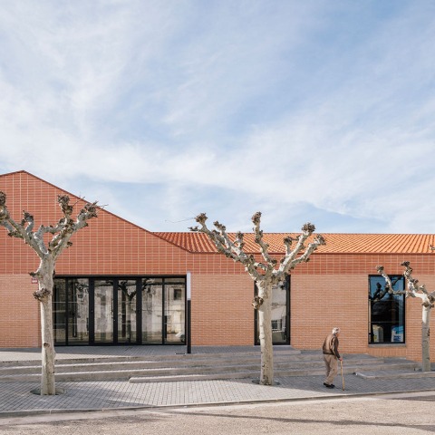 Como pieza urbana, se sitúa en el centro de la plaza: al borde de la antigua carretera y rodeado por dos calles que llevan hacia el torreón árabe, el ayuntamiento y la iglesia. Presenta dos naves macladas en “L” que, manteniendo la huella, el uso y la volumetría del edificio anterior, están concebidas para dotarlo de gran flexibilidad. Los dos espacios principales están configurados para que su uso pueda ser independiente o conjunto, pudiendo llegar a acoger a todos los habitantes. Correderas, tabiques móviles y puertas permiten la prolongación de éstos espacios principales hacia los colchones térmicos; unos espacios intersticiales que, además de favorecer el comportamiento térmico, generan un desahogo espacial diluyendo la división entre plaza y edificio, prolongando las actividades hacia la plaza.