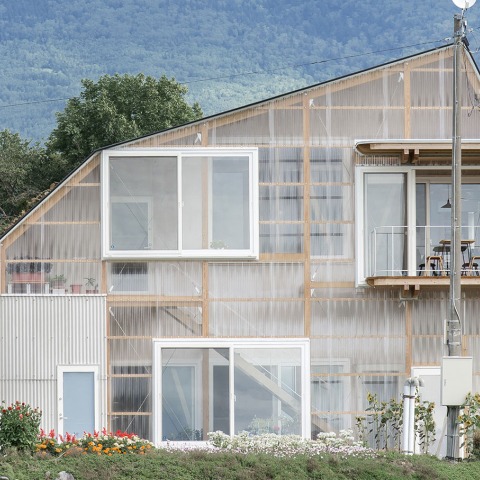 La casa se reformó proyectando la vivienda de los padres en el primer piso, la del niño en el segundo piso, y realizando una ampliación que completase el programa de habitaciones solicitadas. Dado que también se requería una mejora del aislamiento y un refuerzo estructural, la casa se desmontó hasta su estructura y se amplió por 1 "ken" (una unidad japonesa, 1 ken = 1.820 mm) en el extremo del hastial, trazando la forma de la cubierta deformada. La parte ampliada conecta suavemente la vivienda de los padres y la de los niños, funcionando como una unidad compartida con una naturaleza similar a la de un invernadero agrícola, que además cuenta con una terraza, una sala de protección contra el viento y un área de acceso abierta.