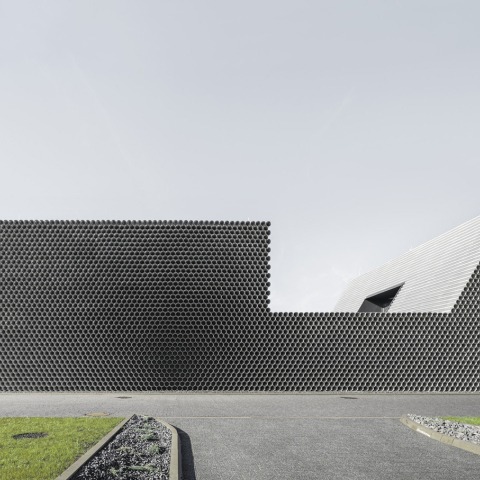 La disposición de las tuberías determinó la inclinación del tejado. La disposición angular de las tuberías crea el único ángulo de inclinación posible, que define la forma de esta parte del edificio. La sección de oficinas con techo inclinado se recortó en la segunda planta para cumplir con el límite de altura establecido por el plan urbanístico local, y el volumen adicional habría sido innecesario.