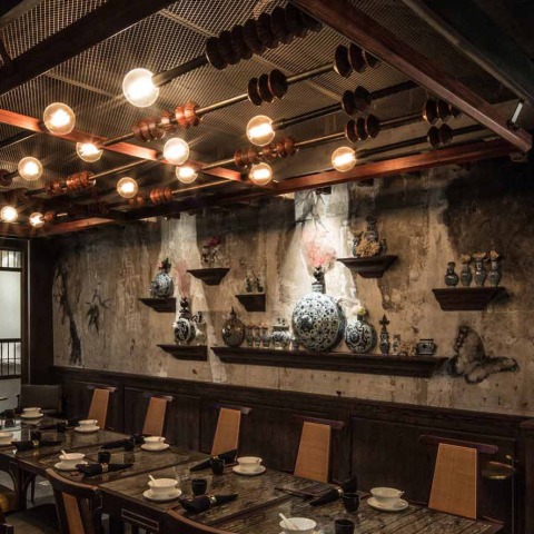 Situado en una antigua instalación de almacenamiento, que una vez albergó caros recuerdos de familia para los inmigrantes chinos ricos, Mott 32 es ahora una experiencia gastronómica en impresionante submundo. Tomando la inspiración de la herencia del sitio, el restaurante está lleno de reliquias olvidadas, la propaganda china y materiales industriales de duplicación como muebles y accesorios de iluminación. Joyce Wang Studio tomó un espacio en descomposición y una decoración tradicional china combinada con elementos de diseño industrial, ya populares en Nueva York y Londres. Situado bajo tierra, sin luz natural, la diseñadora abrazó las limitaciones del lugar y los utilizó para crear una experiencia teatral y exclusiva donde los invitados son guiados a la planta baja a través de un pasillo largo y serpenteante.