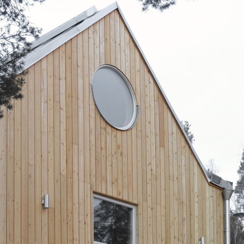 La casa para vacaciones por Metropolis Arkitekter recibió un cambio en las ventanas basado en las diferentes funciones de las habitaciones. En el dormitorio se colocaron ventanas más pequeñas que se abrían para ventilar el espacio, además de otra panorámica de mayor tamaño para disfrutar de las vistas. En la parte superior de los hastiales se colocaron ventanas redondas que permitiesen entrar la luz solar de la mañana. En el salón también se realizaron modificaciones como una puerta corredera de cristal.