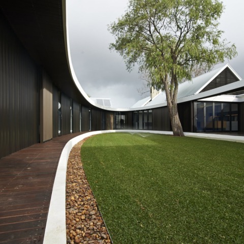 Luigi Rosselli Architects ha terminado una casa en Perth, Australia. Vista desde la calle esta casa familiar sin pretensiones esconde un secreto; un conjunto de pabellones interconectados con un patio-jardín ovalado en su centro.