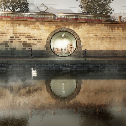 El objetivo del proyecto es restaurar la tradición de los baños fluviales a través de una piscina flotante moderna tipo badeschiff con instalaciones complementarias que cumplen con los requisitos contemporáneos. Los baños públicos flotantes combinan funciones sociales y culturales generales con funciones recreativas y deportivas. La ubicación de los baños se hace eco de la ubicación histórica de las piscinas a lo largo del terraplén de Vltava, con su conexión específica con el terraplén de Rašín.