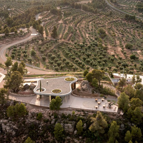 - El diez por ciento restante emerge como único volumen visible espacio de espacio de recepción donde poder comprar, degustar los productos de la finca, y disfrutar de las increíbles vistas de 360º.