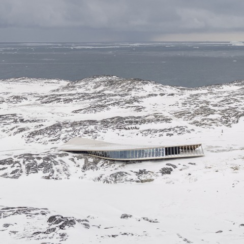 El entorno ártico único perfila el proyecto del Icefjord Centre. La compleja estructura del edificio consta de 50 pórticos de acero estructural, creando una forma de boomerang, casi parecida a los restos de un animal que yace en el terreno rocoso. Esta forma aerodinámica evita la acumulación de nieve, lo que permite que el viento la arrastre lejos de la fachada. En primavera, cuando la nieve se derrite, el agua derretida sigue su camino original debajo del edificio hacia el lago Sermermiut. La cubierta proporciona una prolongación natural de las rutas de senderismo de la zona, lo que lleva a los visitantes a uno de los mejores miradores para ver los enormes icebergs del fiordo y el paisaje circundante. Se crea como un espacio público, una especie de puerta de entrada entre la ciudad de Ilulissat y el desierto infinito. Está abierta al público y es de libre acceso. En cada extremo del edificio, también hay espacios cubiertos, creando refugio y lugares de reunión.