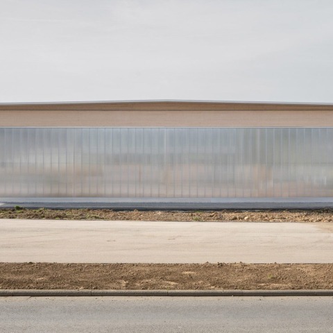 Una fachada de policarbonato translúcido con puertas seccionales de dos piezas rodea la nave de almacenamiento y producción.