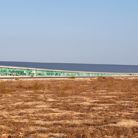 La escala del edificio se oculta como resultado de una manipulación en corte y planta y la creación de una duna artificial que envuelve la dimensión vertical de la estructura. Al pie de la duna y frente a las caras norte del edificio, un lago artificial utiliza las aguas residuales depuradas para crear un lugar de descanso para las aves migratorias y suavizar aún más el impacto de la enorme estructura sobre el suave paisaje que lo rodea.