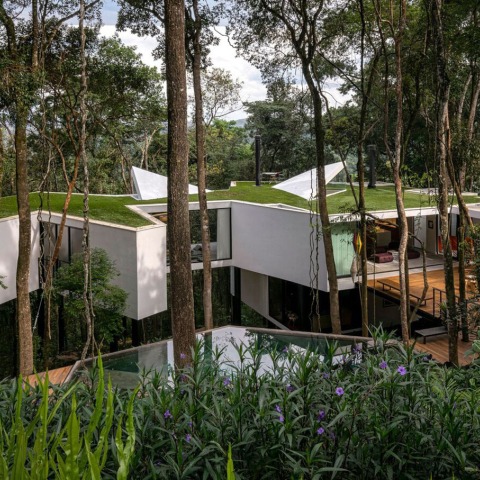 El proyecto es una respuesta a una lectura sensible del lugar. En un primer contacto con este terreno, ya se hace evidente la necesidad de mantener las características naturales. El acto de mirar hacia arriba, desde el suelo hasta la copa de los árboles, elevados hasta quince metros sobre el nivel del suelo, fue decisivo para la creación del concepto. ¿Cómo construir en un lugar con una topografía tan abrupta, manteniendo la naturaleza original? Cómo brindar a los residentes la experiencia diaria de mirar hacia arriba y ver el cielo a través de las copas de los árboles. Estas fueron las preguntas que guiaron todas las decisiones de diseño.