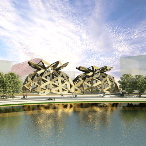 La estructura se compone de una gran rejilla tridimensional que se transforma gradualmente en ramas tejidas, a medida que crece en las partes superiores de la cúpula. Los elementos estructurales se conviertan en arquitectura, diseñadas tanto en el interior como en las fachadas exteriores como ramas de árboles; los espacios vacíos de la rejilla mejoran la permeabilidad de la luz, y aportan continuidad visual entre el exterior y el interior.