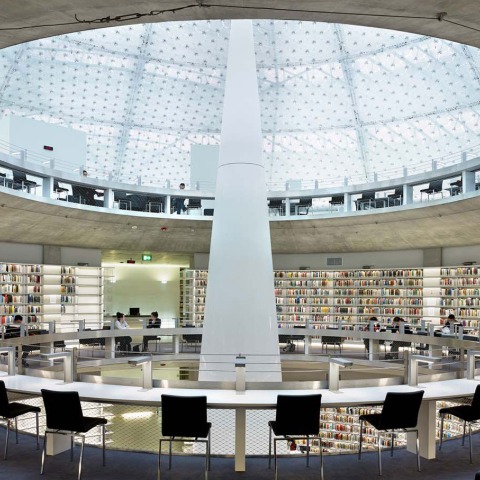La cúpula que cubre la sala principal de lectura de la biblioteca está delicadamente situada en la "meseta" de la colina y rodeada por una terraza plantada.