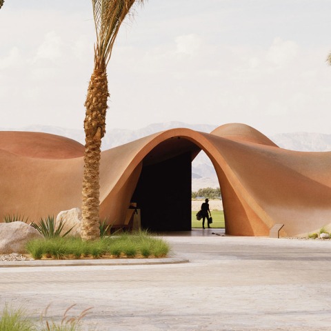La cáscara de hormigón proyectada curva se mezcla con la arena como dunas en lugar de tener paredes y techos convencionales. Las aberturas curvas enmarcan las vistas del campo de golf y las coloridas montañas de Aqaba en el fondo.