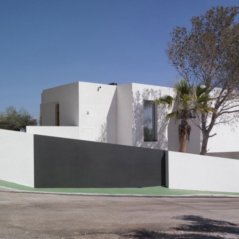 En cuanto a materialidad, la vivienda se presenta como una pieza rotunda blanca, color característico de esta zona del mediterráneo, que contrasta con el gris antracita de la carpintería metálica y de otros elementos complementarios. Entre estos dos colores (que constituirán la base cromática de la vivienda), se sitúa el del suelo, ofreciendo un tono gris oscuro que debido a la presencia del sol durante prácticamente todo el día se percibe como más claro. Este pavimento se materializa tanto en el interior como el exterior, incluso en la piscina, de forma que se obtiene la continuidad que se busca al querer relacionar estos dos ámbitos de la casa. En el interior destaca el espacio que enlaza el acceso con la comunicación vertical, puesto que la escalera se desarrolla en piezas metálicas voladas muy ligeras, que además comparten ámbito con un espacio a doble altura, lo que consigue relacionar visualmente la entrada de la casa tanto con las vistas al paisaje en recto, como con el pequeño salón de la planta baja en diagonal.