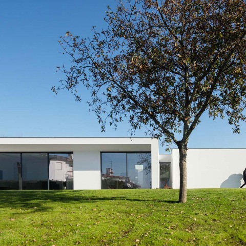 La simplicidad se utilizó en el diseño de la casa y en la organización de los espacios, pero también en la construcción, utilizando materiales típicos de la construcción portuguesa. En el interior, las superficies de paredes y techos con paneles de yeso pintados en blanco mate están en armonía con los elementos de MDF lacados en blanco (puertas y gabinetes), los lavabos de krion blanco y el tono blanco x-tone de la encimera de la cocina, lo que permite evidenciar los suelos de madera de riga nova, con sistema de calefacción por suelo radiante hidráulico.