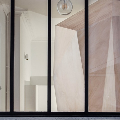 Enter the diamond [Entra en el diamente] es una escultura funcional instalada en París, en el corazón de un apartamento de Haussmann. Este volumen de madera de abedul contiene dos salas de ducha. Al crear este pequeño espacio singular en el espacio más amplio de la vivienda, jugamos con las variaciones de densidad. Esta escultura se integra perfectamente con el minimalismo del lugar, aunque contrasta fuertemente con las molduras y el clasicismo de Haussmann. Esta tensión genera un potencial de ficción que juega con la imaginación de los habitantes. Nuestro objetivo es crear un paisaje interior en esta sala-entrada visible desde todas las demás habitaciones, incluyendo la cocina, los 3 dormitorios y la sala de estar. Más allá de su función -Ducha con diamantes- esta instalación es una forma de enigma estético, semejante a una ventana que aporta paisajes inverosímiles. Esta escultura es la continuación de nuestra serie de escultura inmersiva.