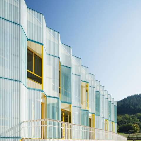 Da frente a las pistas de juego del complejo escolar del municipio ubicado en la periferia del pueblo, hacia un espacio al que hasta ahora prácticamente se le han negado fachadas a pesar de haber edificaciones. Intencionadamente la fachada evoca la relación interior-exterior, aula-patio. Se entiende el patio como una prolongación de la escuela.
