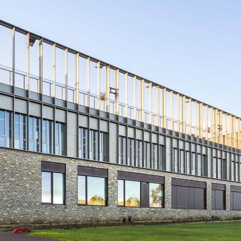 Los diferentes elementos del programa se distribuyen en 4 alas unidas por una galería central y espacios exteriores. El podio de piedra del proyecto (toda la planta baja), recuerda los muros de las antiguas fábricas de cartuchos del parque. Stone también hace referencia a una imagen de protección y seguridad, como un recinto. La fachada de la Rue au Sud está animada por la explanada, el acceso al grupo escolar y la guardería, con su amplia abertura acristalada, cuya transparencia se percibe en el corazón del proyecto, hacia la galería, como una especie de calle central, marcando el interior/exterior.