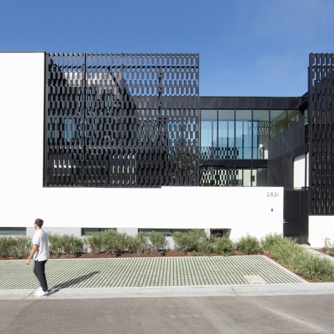 Un muro pantalla tridimensional de aluminio anodizado, ejecutado a medida, en el lado este proporciona privacidad a los espacios que rodean el patio del tráfico de la calle, a la vez que hace que la fachada brille con el paso de la gente. La luz del sol y la iluminación intensa hacen que la fachada se vuelva suave y plateada en tan solo unos segundos. Es un fenómeno dinámico que desvía la luz y proyecta sombras según la hora del día. Estas estrategias pasivas por sí solas hacen que este edificio sea más de un 40% más eficiente que el Título 24 de California y una estructura similar diseñada de manera convencional.