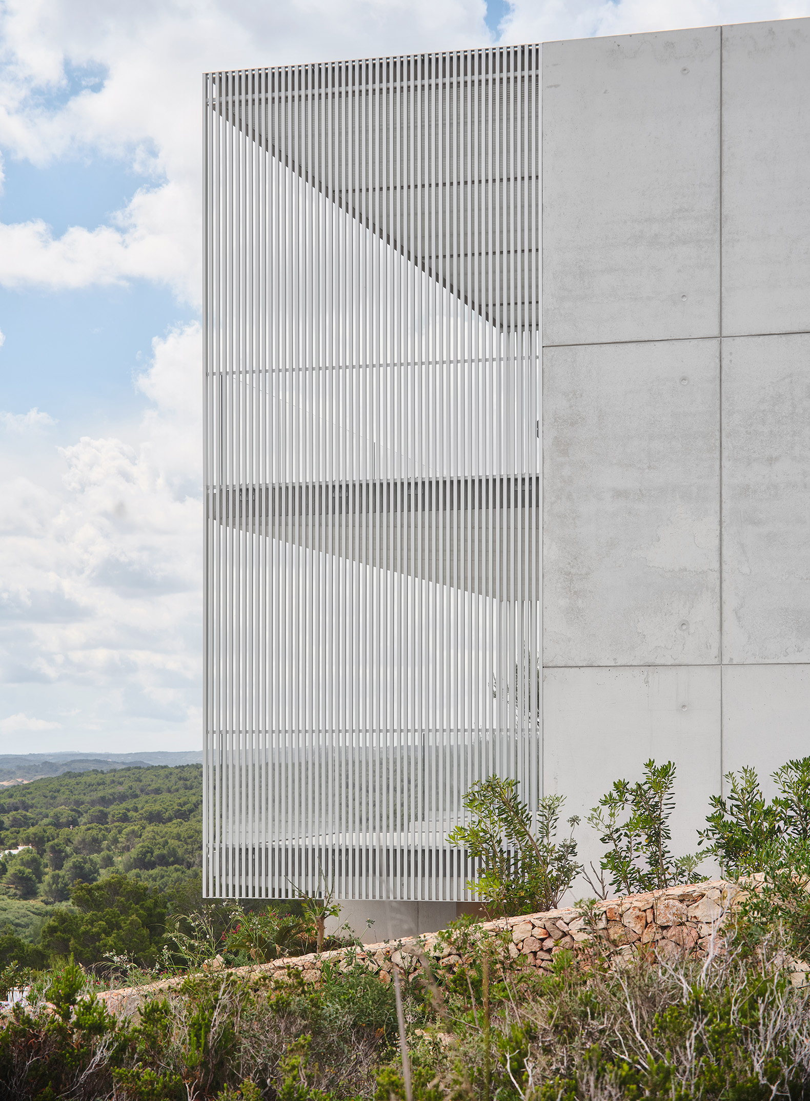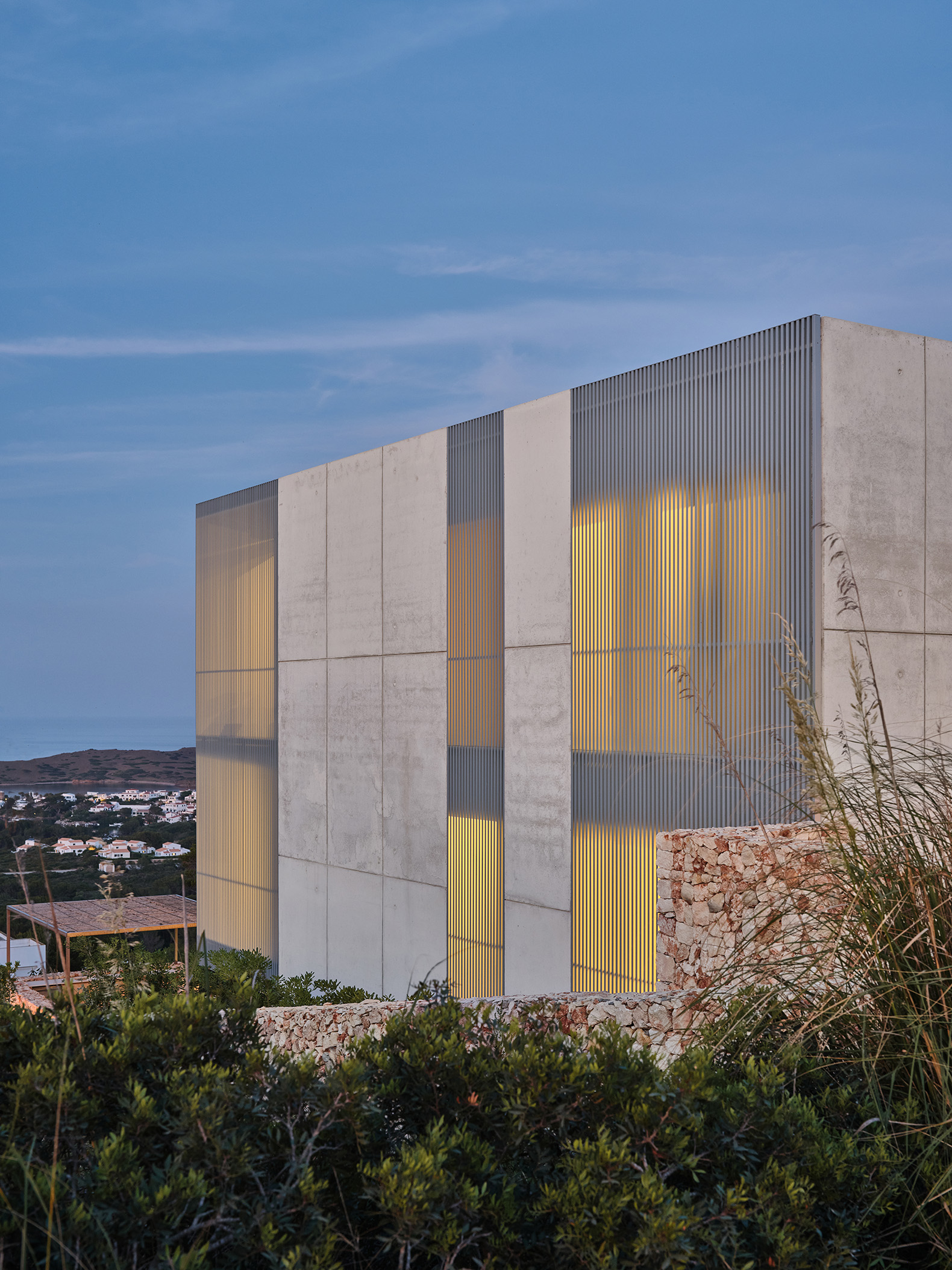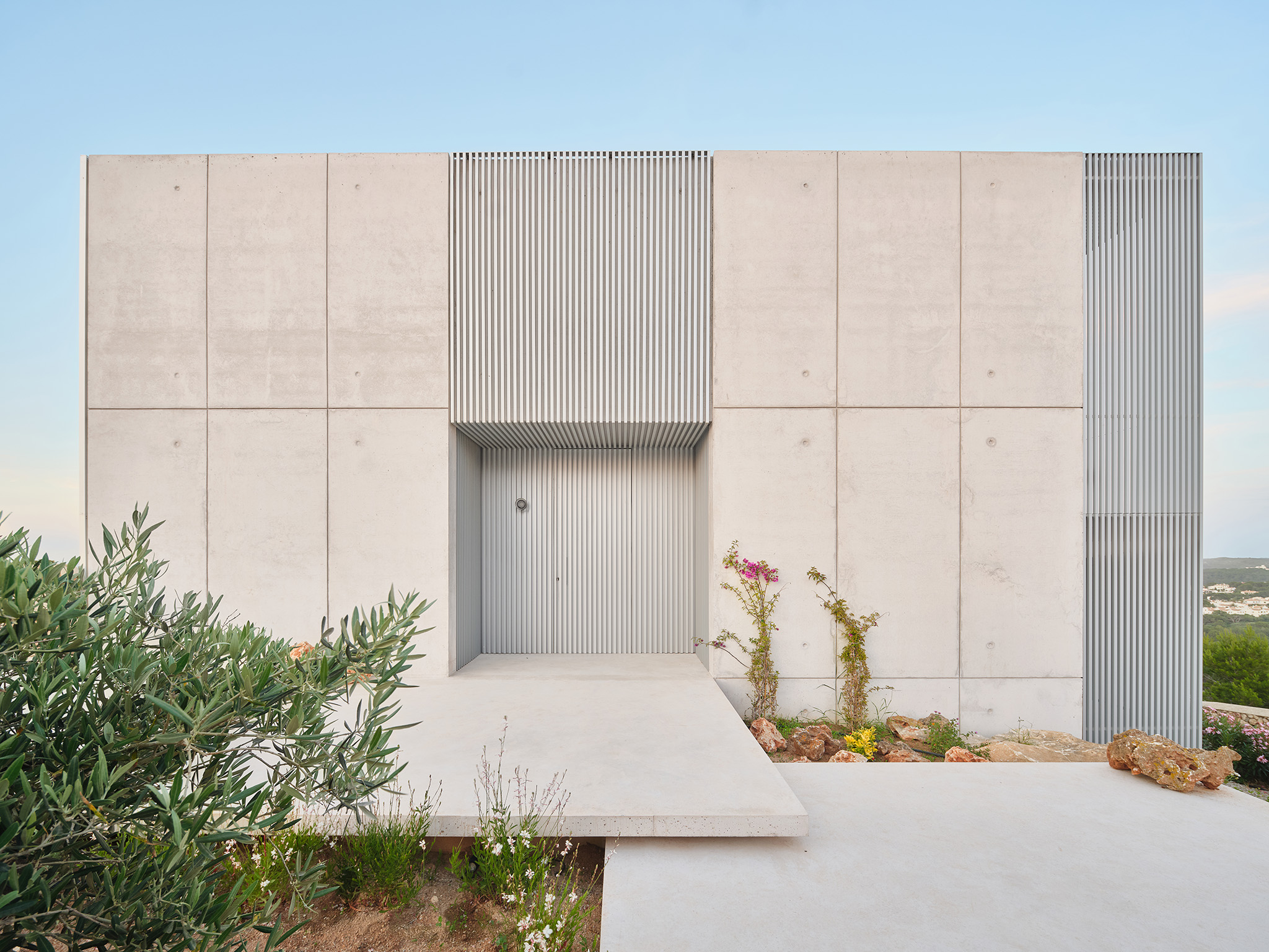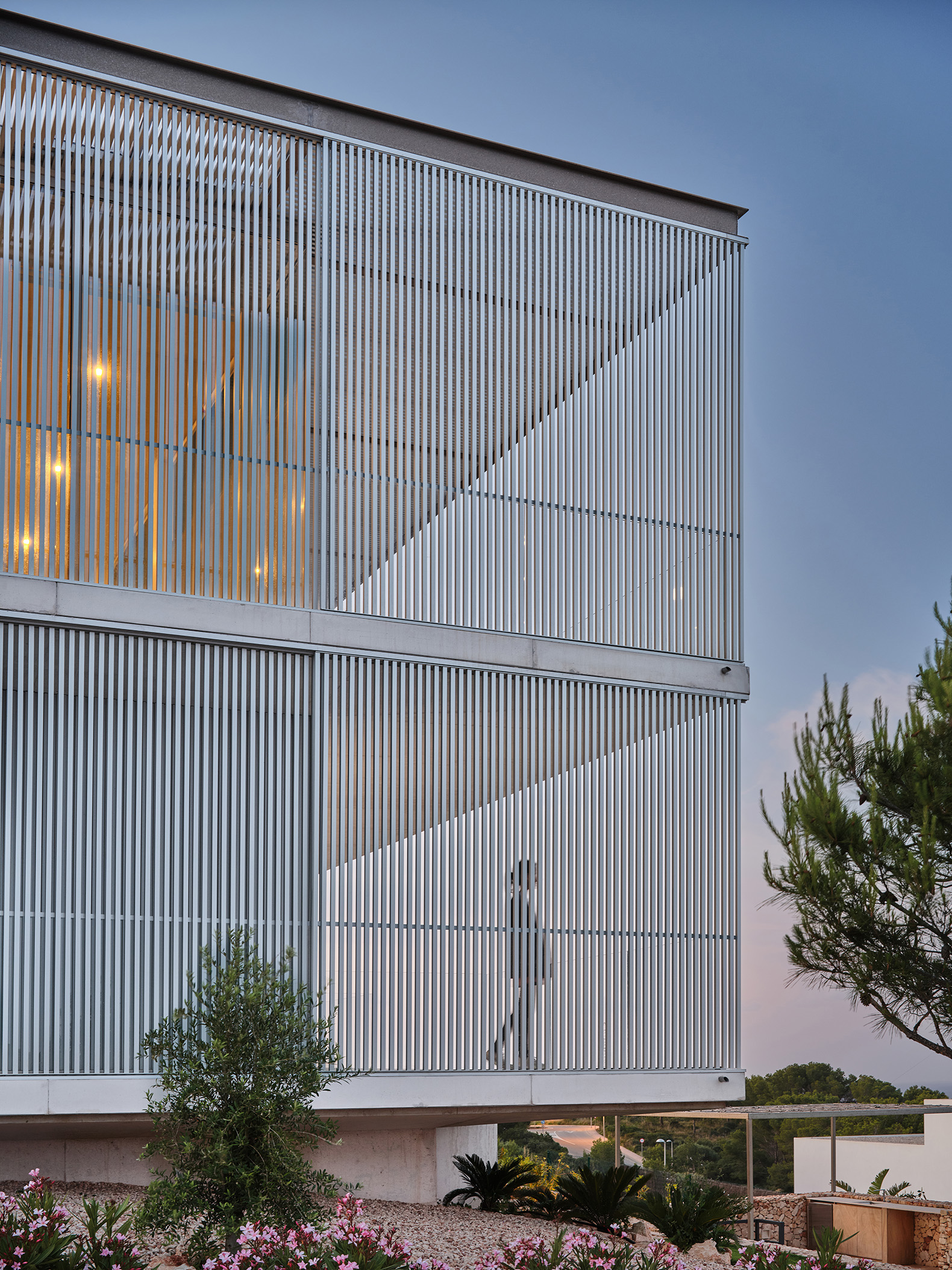 Un sistema de lamas de perfil vertical —fijas y móviles— actúa como mecanismo para regular la luz y las vistas. Estas filtran la luz solar, proporcionan privacidad y, al mismo tiempo, permiten las vistas desde el interior. La doble piel creada entre el cerramiento acristalado y las lamas forma un espacio intermedio sombreado, una zona ambigua entre el interior y el exterior que se integra a la vivienda mediante grandes puertas correderas de cristal. A lo largo del día, la interacción entre la luz y la materialidad genera una percepción cambiante de la envolvente, donde las variaciones cromáticas del hormigón, el aluminio y el vidrio absorben y reflejan la atmósfera del paisaje circundante.