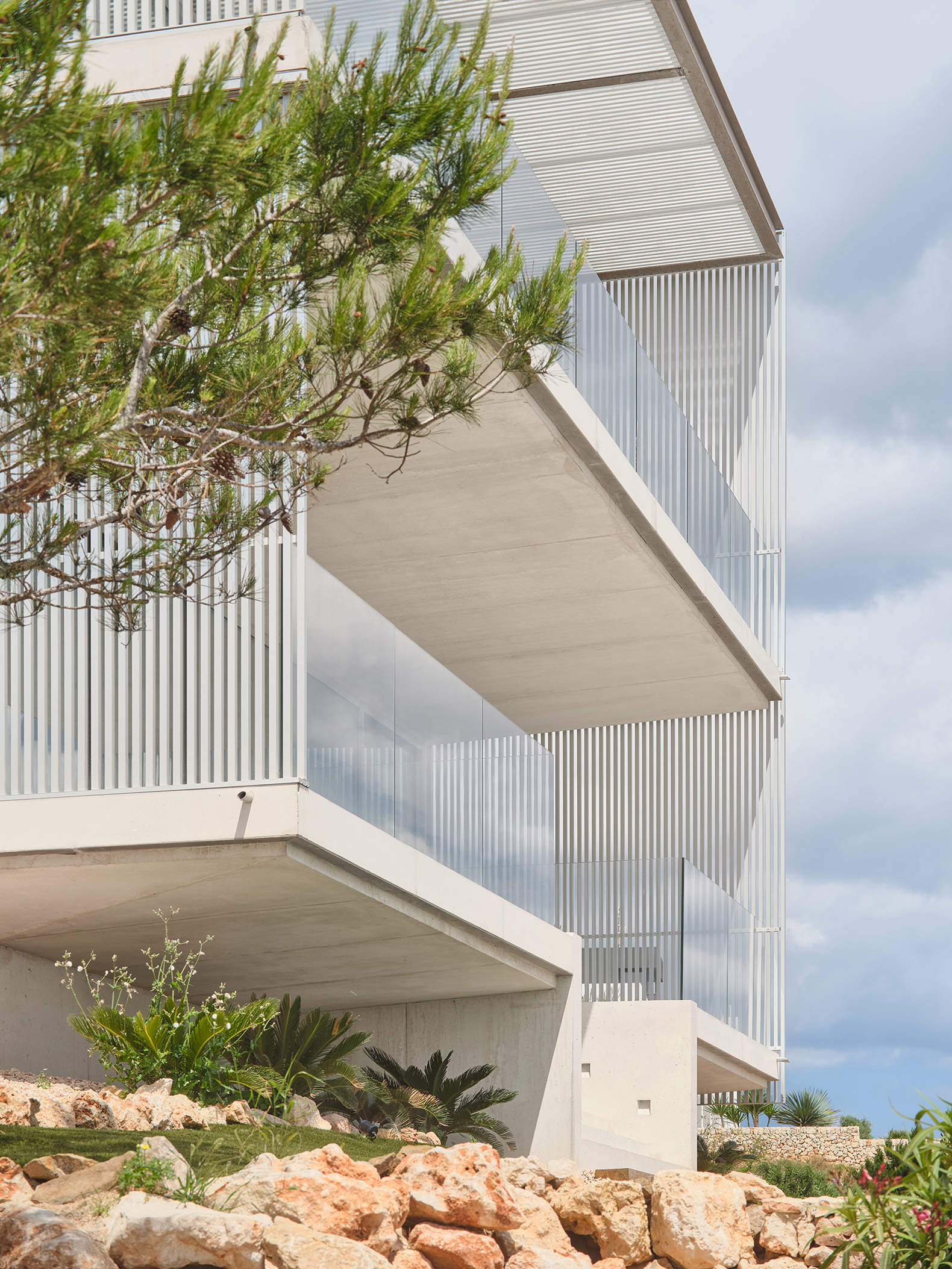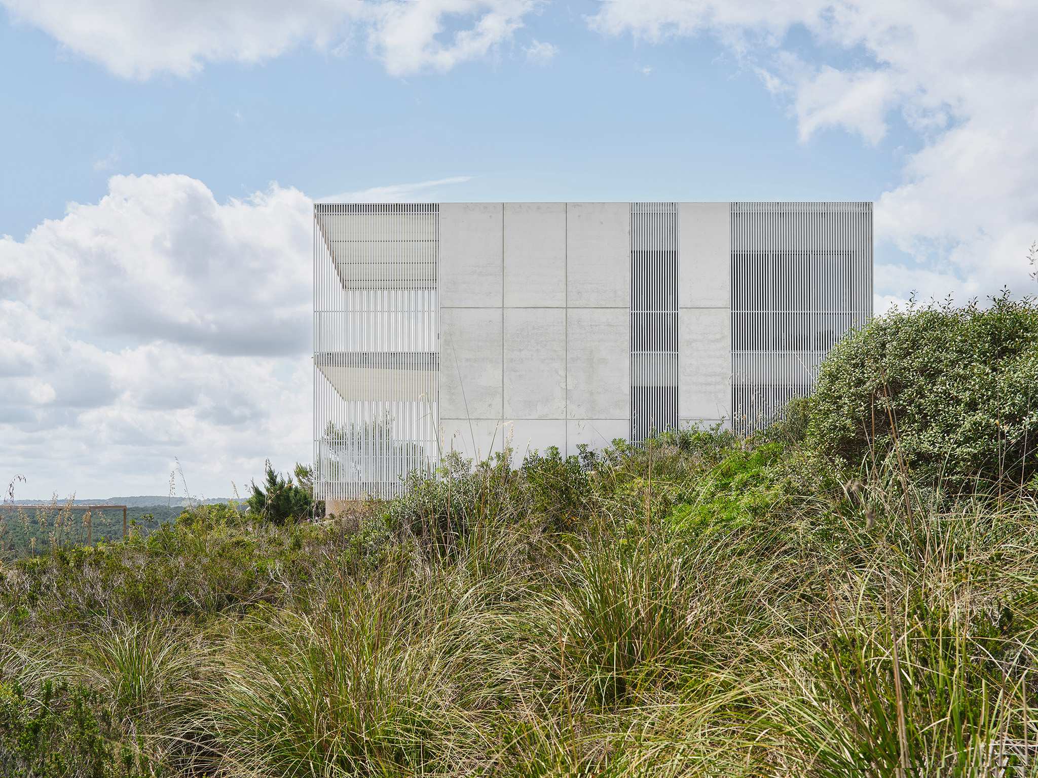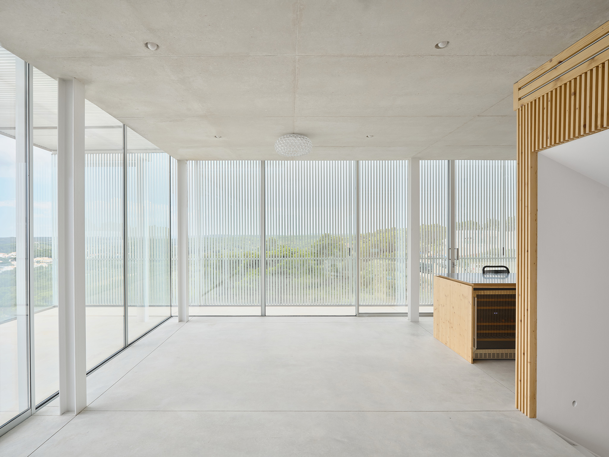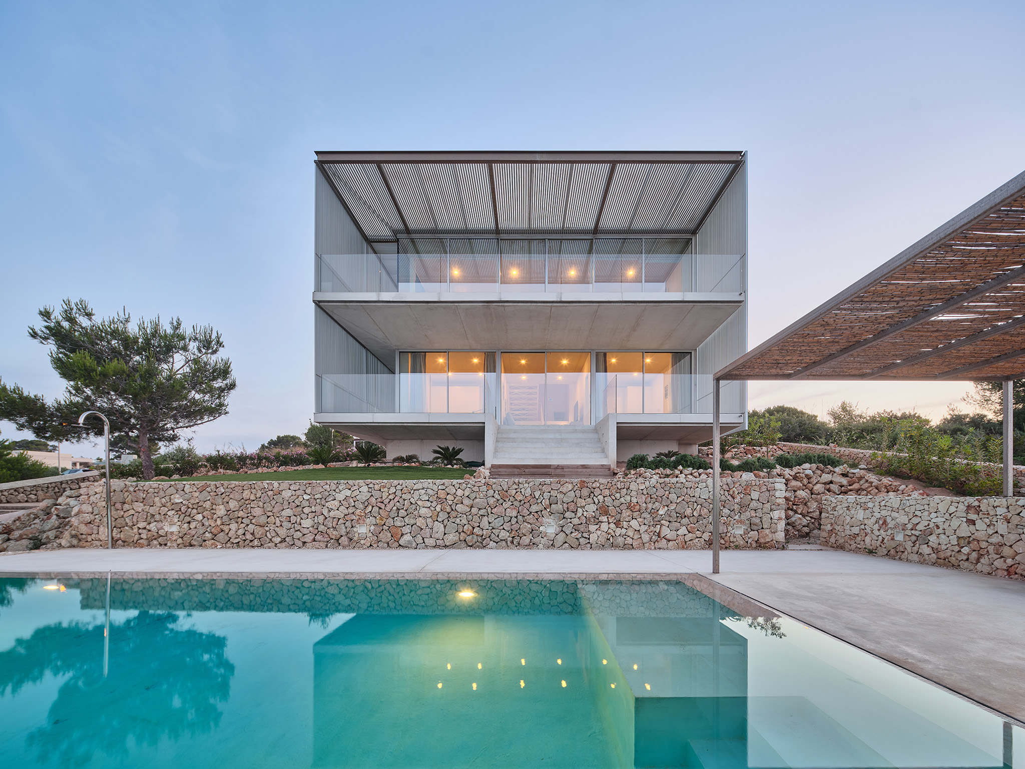 Un sistema de lamas de perfil vertical —fijas y móviles— actúa como mecanismo para regular la luz y las vistas. Estas filtran la luz solar, proporcionan privacidad y, al mismo tiempo, permiten las vistas desde el interior. La doble piel creada entre el cerramiento acristalado y las lamas forma un espacio intermedio sombreado, una zona ambigua entre el interior y el exterior que se integra a la vivienda mediante grandes puertas correderas de cristal. A lo largo del día, la interacción entre la luz y la materialidad genera una percepción cambiante de la envolvente, donde las variaciones cromáticas del hormigón, el aluminio y el vidrio absorben y reflejan la atmósfera del paisaje circundante.