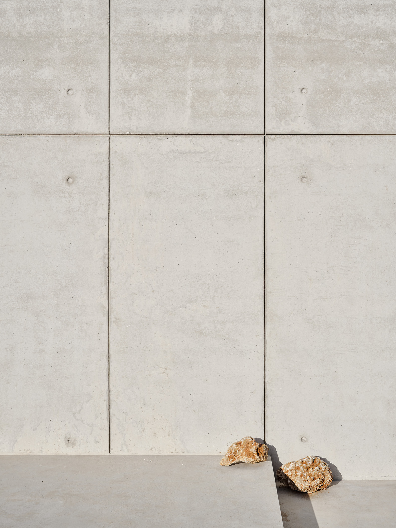 El hormigón visto, presente tanto en el interior como en el exterior, revela un trabajo meticuloso en la disposición del encofrado, donde las ranuras precisas resaltan la repetición de segmentos y la integración de elementos constructivos —luminarias, bordes de goteo, rieles empotrados y sistemas de ocultación— dentro de una lógica tectónica coherente.