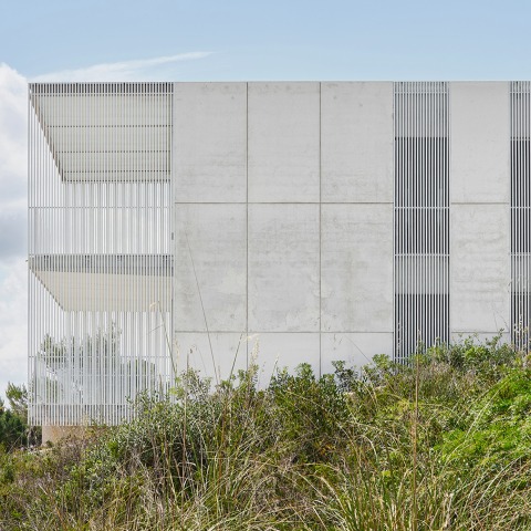 La envolvente, de composición rigurosa y minimalista, deriva su riqueza del tratamiento de sus tres materiales esenciales: hormigón, metal y vidrio, organizados en grandes superficies interrumpidas por bandas verticales que enfatizan la proporción y la modulación del conjunto. Los materiales se muestran en su estado más puro, sin revestimientos ni adornos, favoreciendo un envejecimiento natural que realza el contraste entre la solidez del hormigón y la ligereza del aluminio y el vidrio.